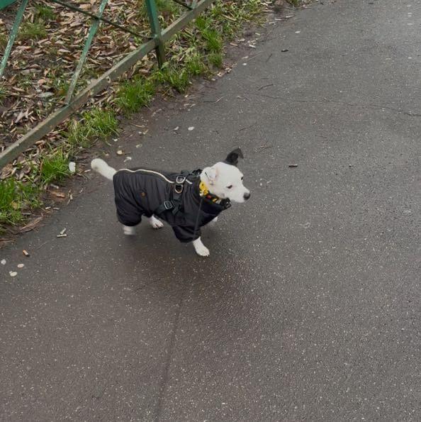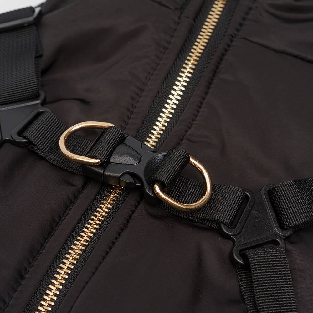 - К куртке пришита шлейка с застежкой фастекс и металлическими кольцами для крепления поводка.