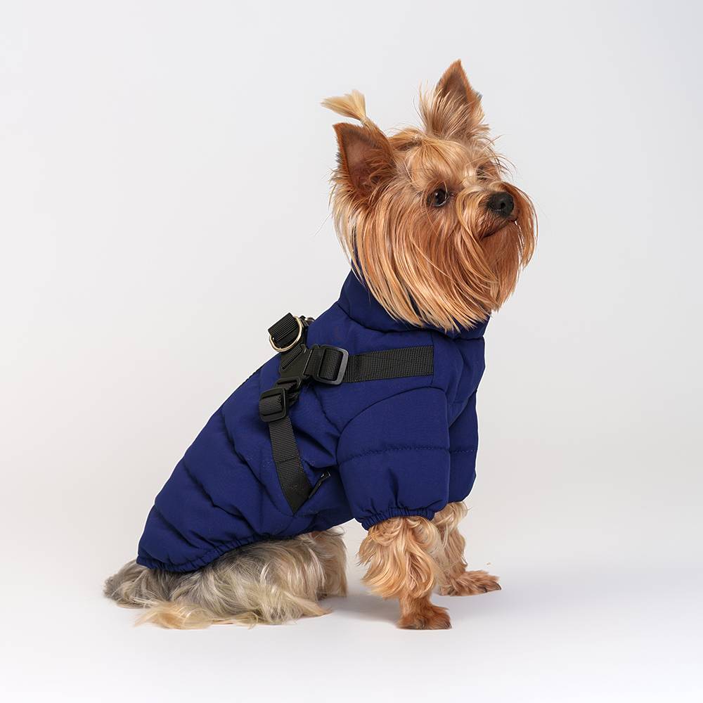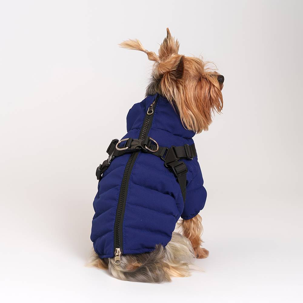 - К куртке пришита шлейка с застежкой фастекс и металлическими кольцами для крепления поводка.