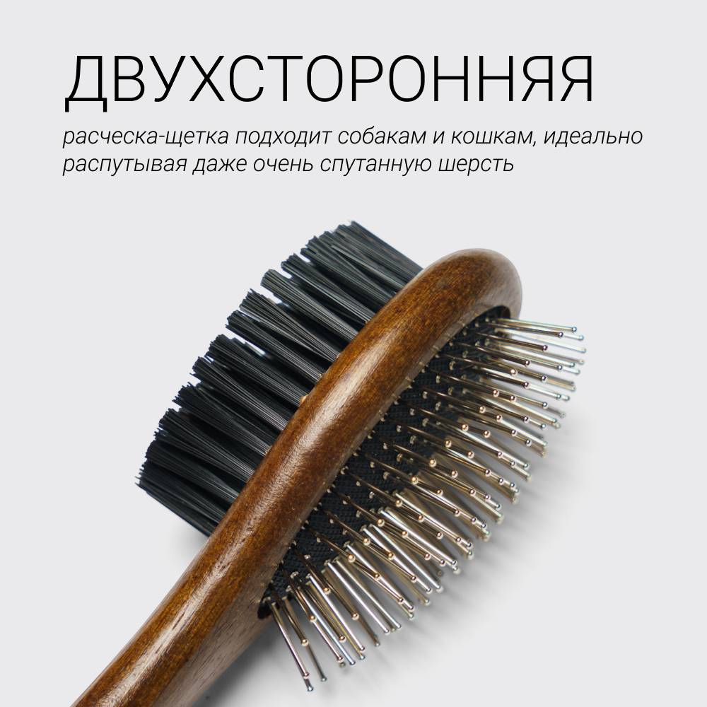 Рекомендации по использованию: расчесывайте питомца в направлении от головы к хвосту, используя в первую очередь металлическую щетину расчески для удаления старой шерсти из подшерстка. Затем смягчите шерсть, используя другую сторону расчески со щетиной.