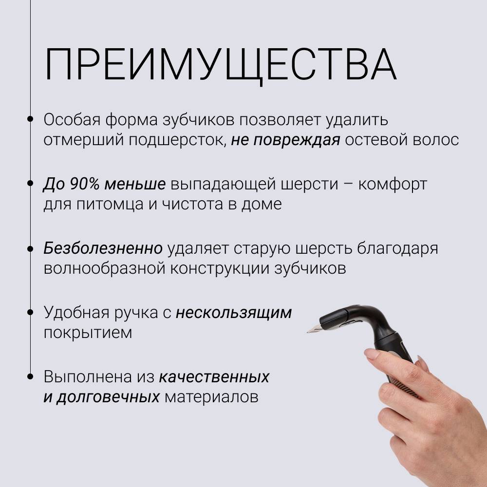 - Особая форма зубчиков позволяет удалить отмерший подшерсток, не повреждая остевой волос.