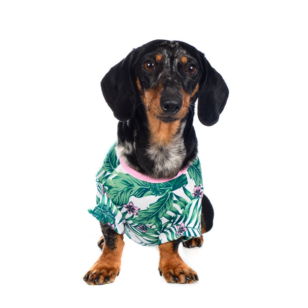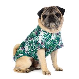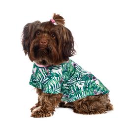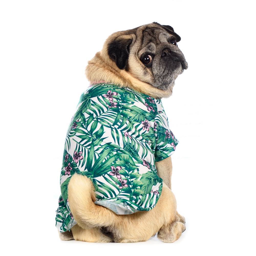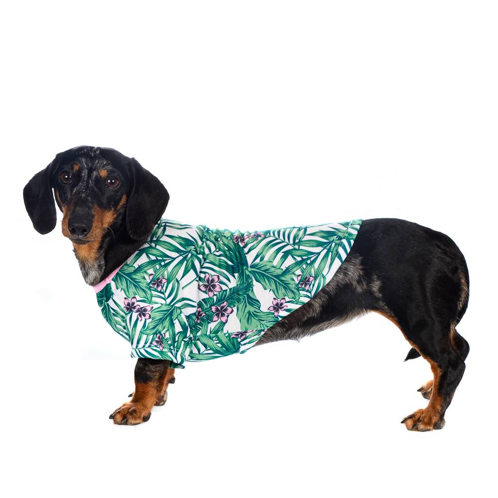 Летний и сочный наряд для вашего пушистого модника: рубашка с принтом с тропическими листьями и контрастными цветами, в которой ваша собака точно не останется незамеченной.