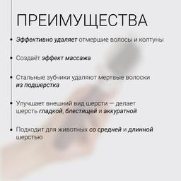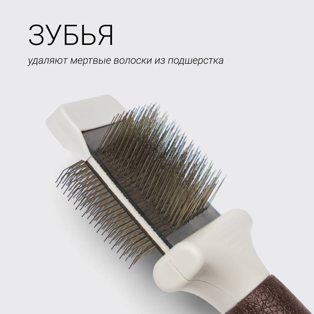 - Стальные зубчики удаляют мертвые волоски из подшерстка.