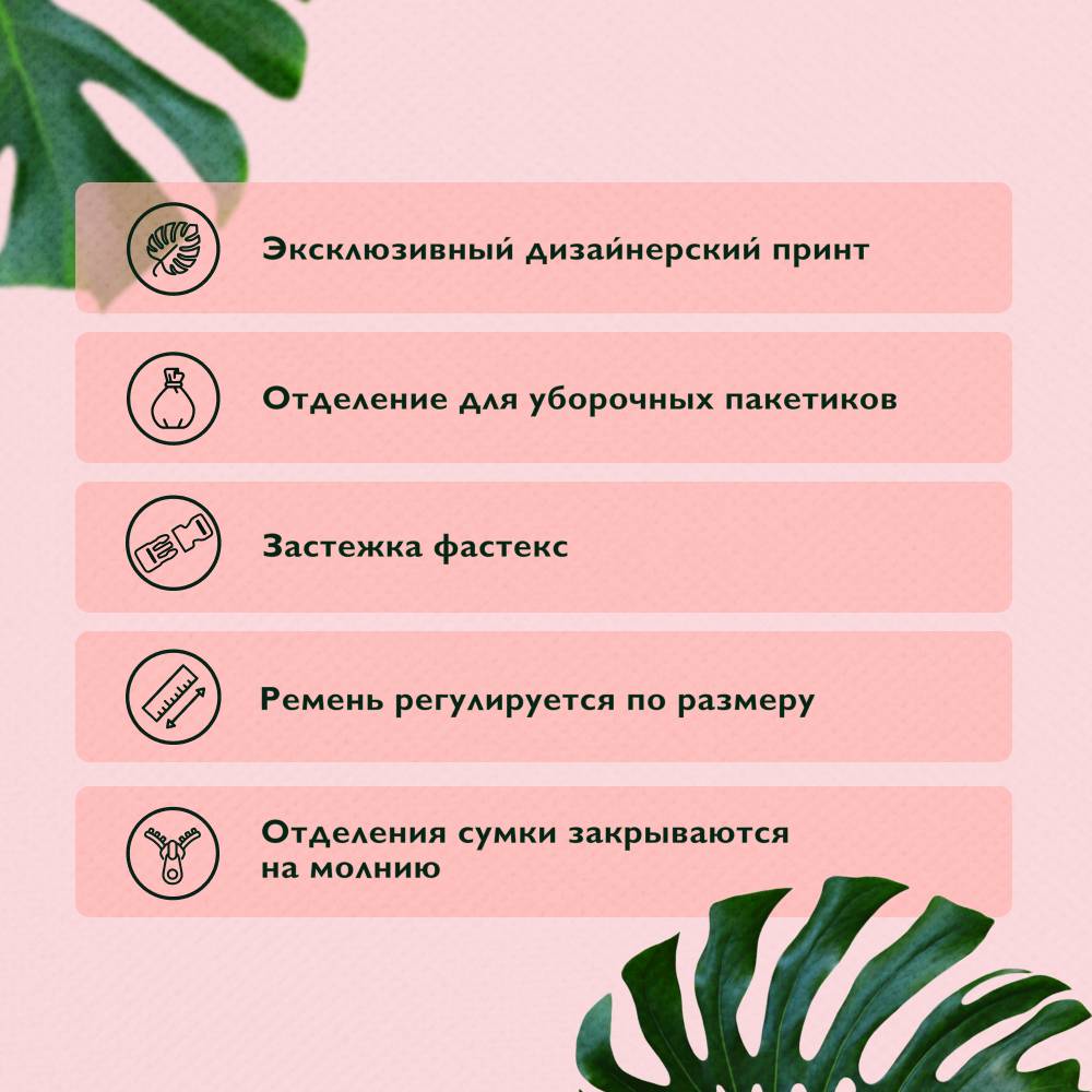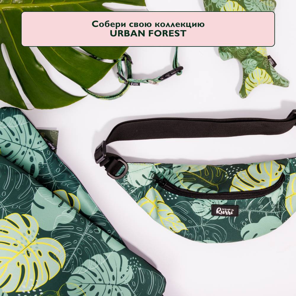 Сумка поясная для лакомств Urban forest станет удобным и многофункциональным аксессуаром для прогулок и поездок с питомцем. Благодаря своему яркому и стильному принту в виде зеленых листьев, вы и ваш питомец не останетесь без внимания.