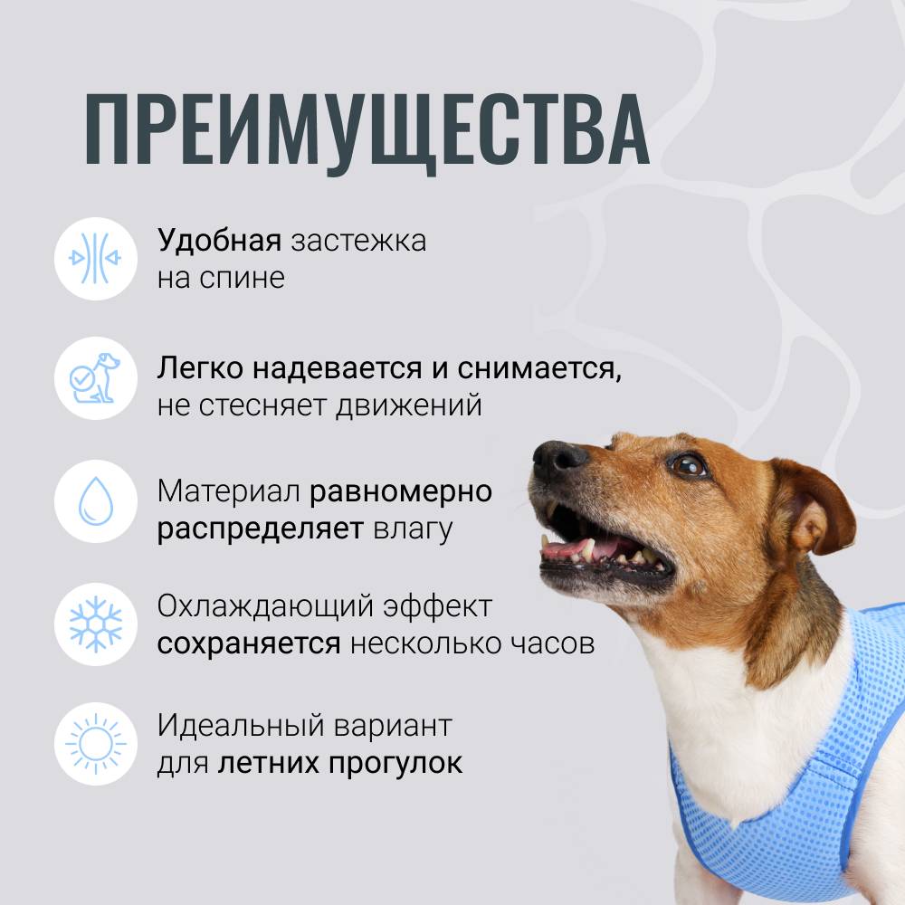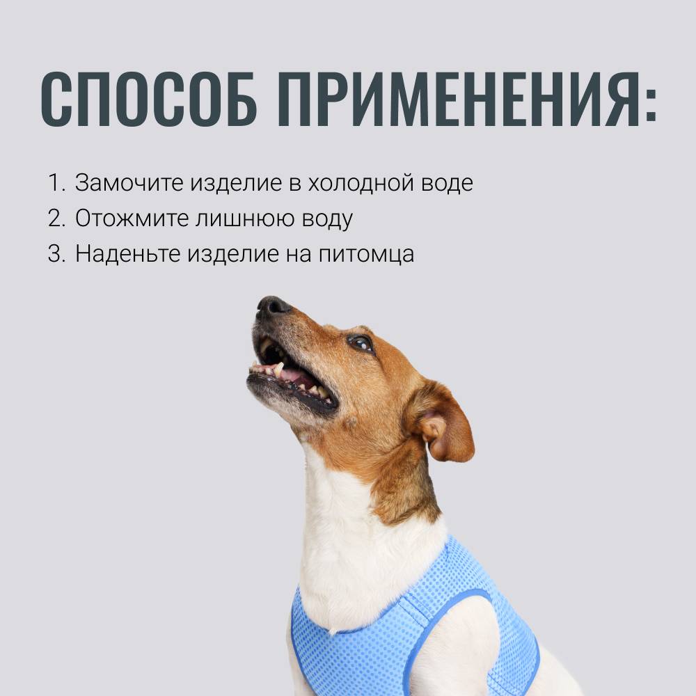 - Охлаждающий эффект – замочите изделие в холодной воде, отожмите лишнюю вод и наденьте на питомца.