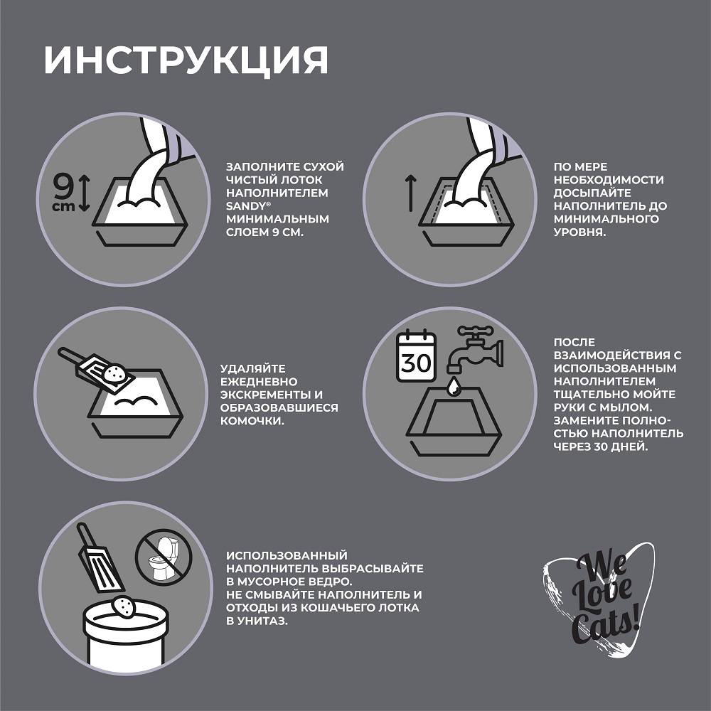 - После взаимодействия с использованным наполнителем тщательно мойте руки с мылом.