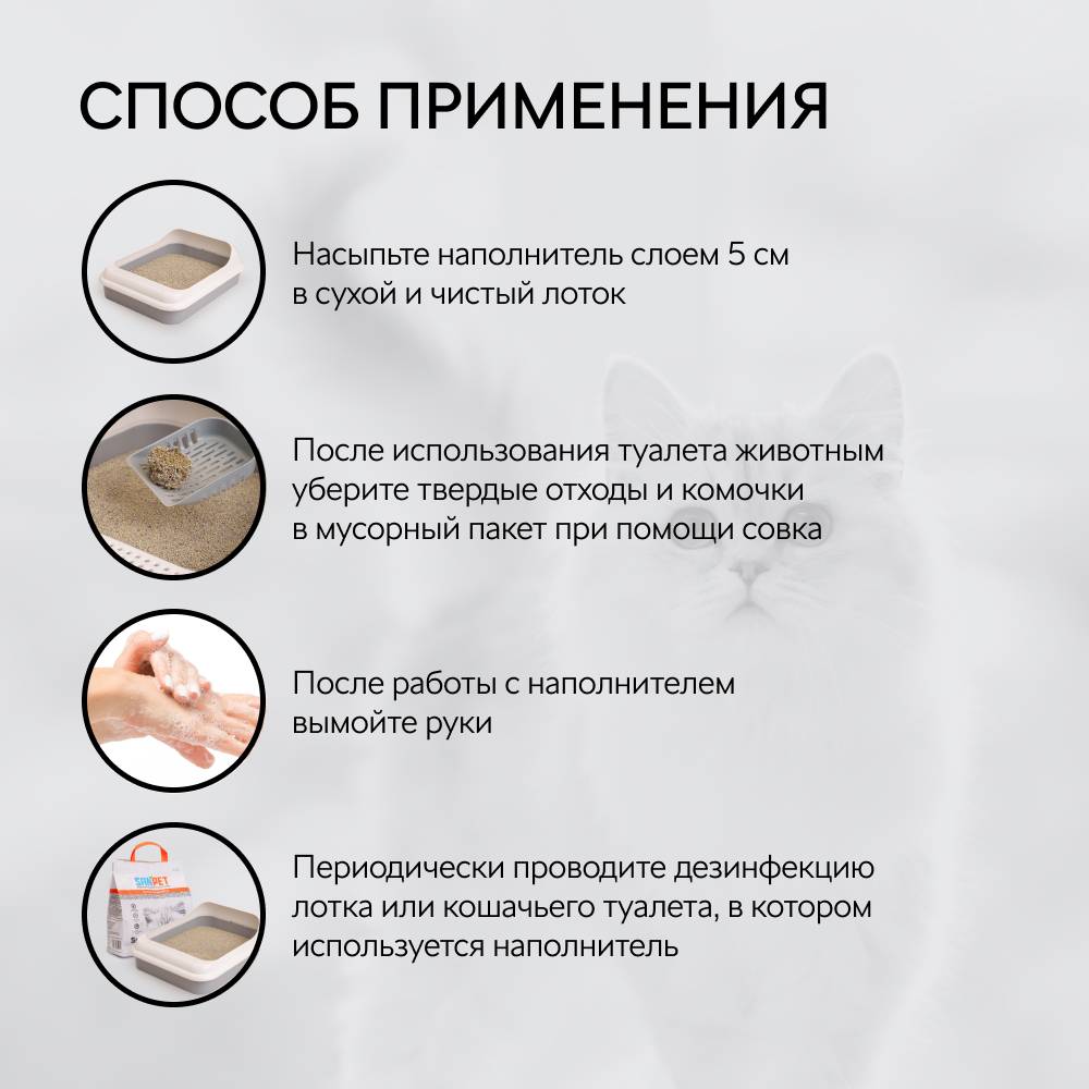 Рекомендуется использовать в лотке с высокими бортиками или закрытом кошачьем туалете.