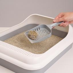 - После использования туалета животным уберите твердые отходы и комочки в мусорный пакет при помощи совка.