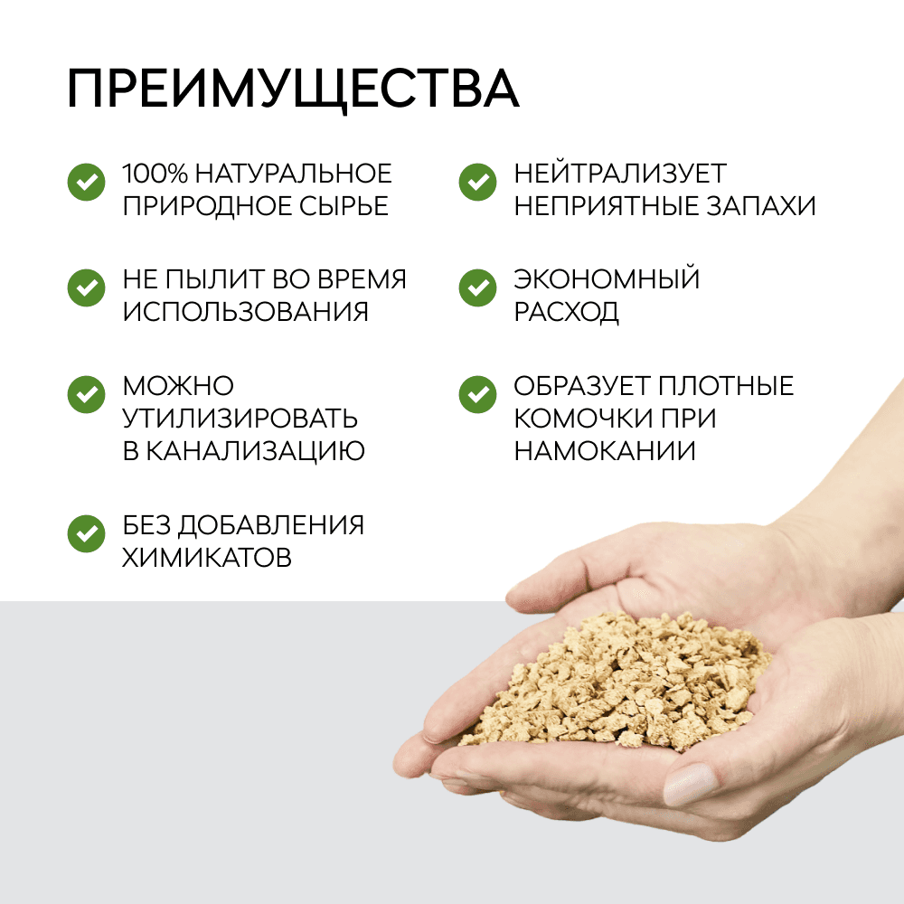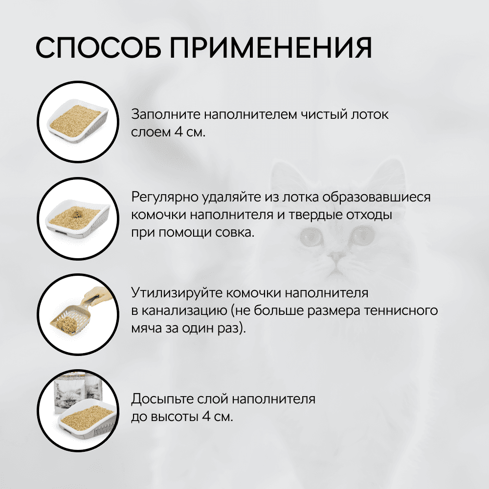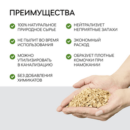 - Образует плотные комочки при намокании, которые удобно отделять от неиспользованной части наполнителя.