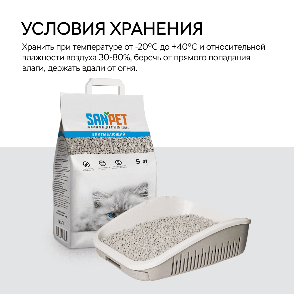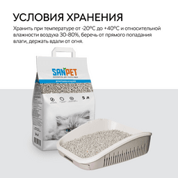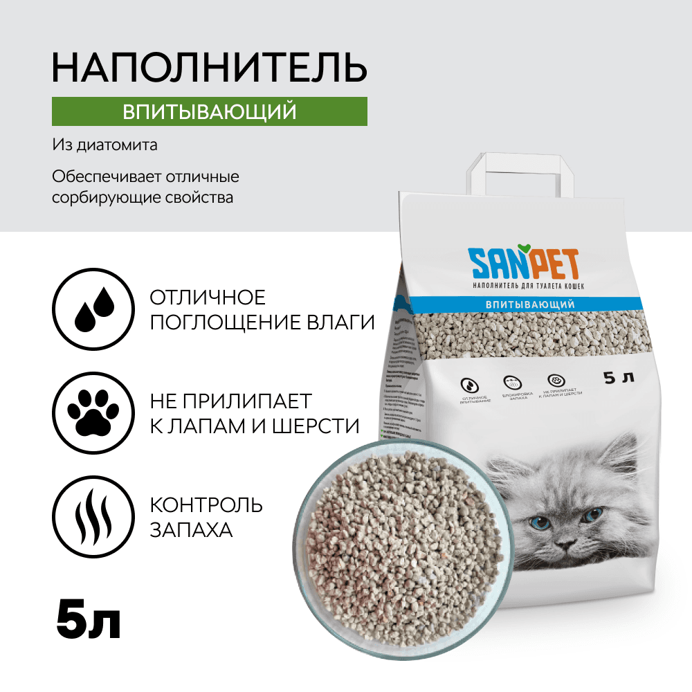 Впитывающий наполнитель SanPet на основе природного минерала диатомита обеспечивает отличные сорбирующие свойства: удерживает жидкость и предотвращает появление неприятного запаха.