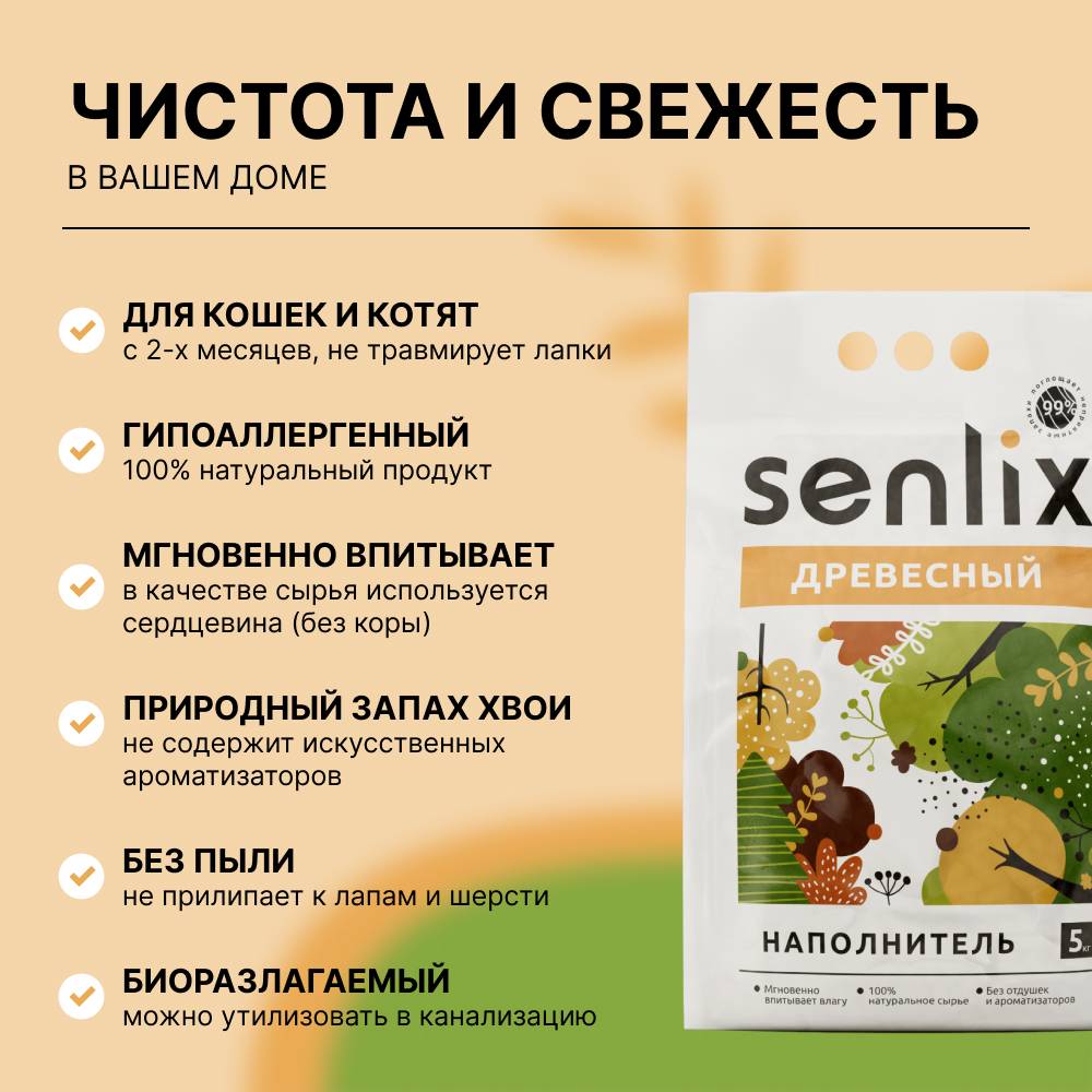 Древесный гранулированный наполнитель Senlix – органический продукт, изготовленный из высококачественной экологически чистой древесины хвойных пород, обладает приятным ароматом хвои, не содержит искусственных добавок.