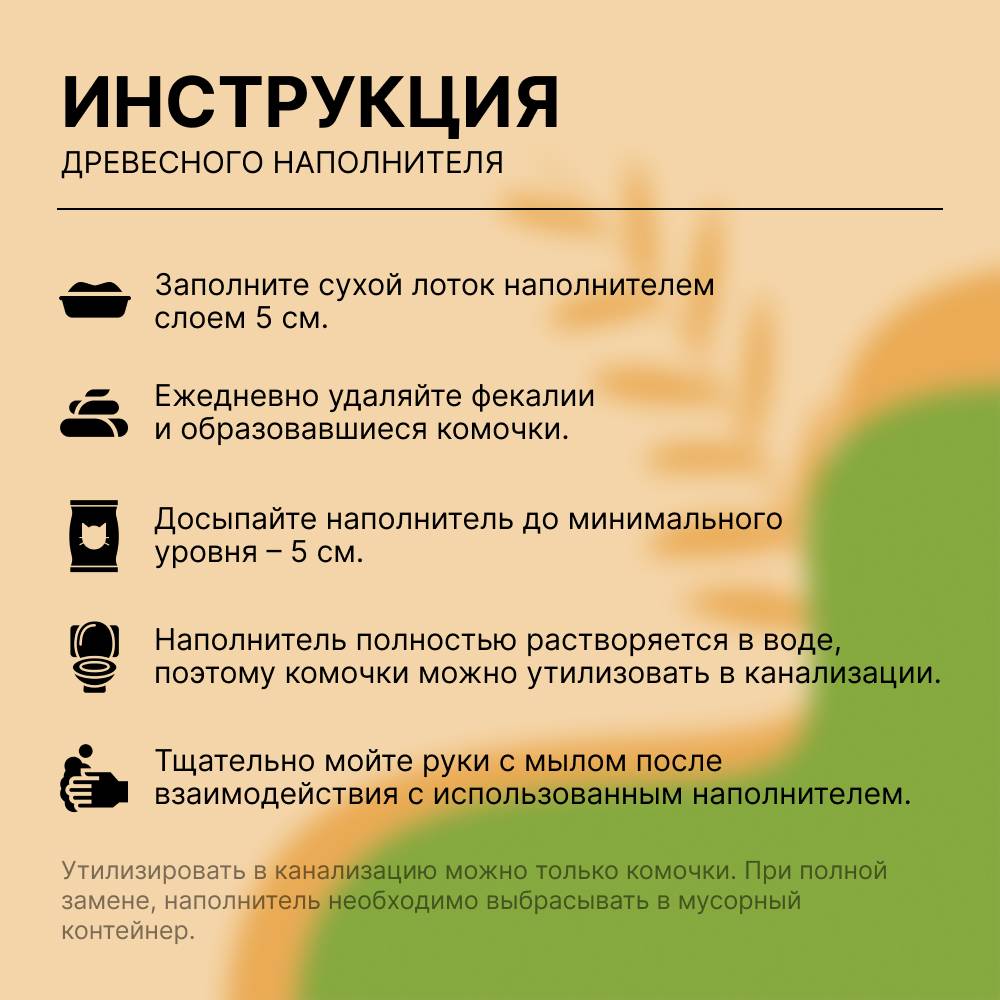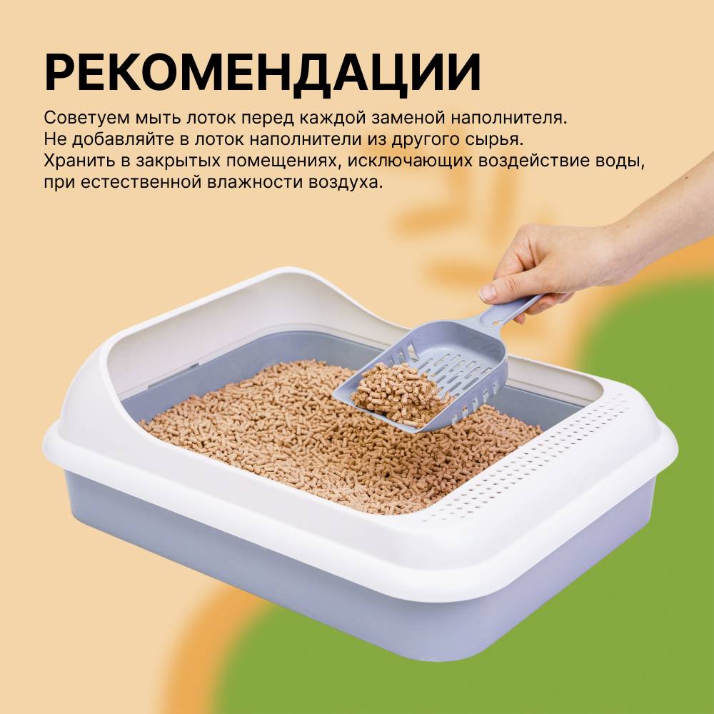 Рекомендации: Советуем мыть лоток перед каждой заменой наполнителя. Не добавляйте в лоток наполнители из другого сырья. Хранить в закрытых помещениях, исключающих воздействие воды, при естественной влажности