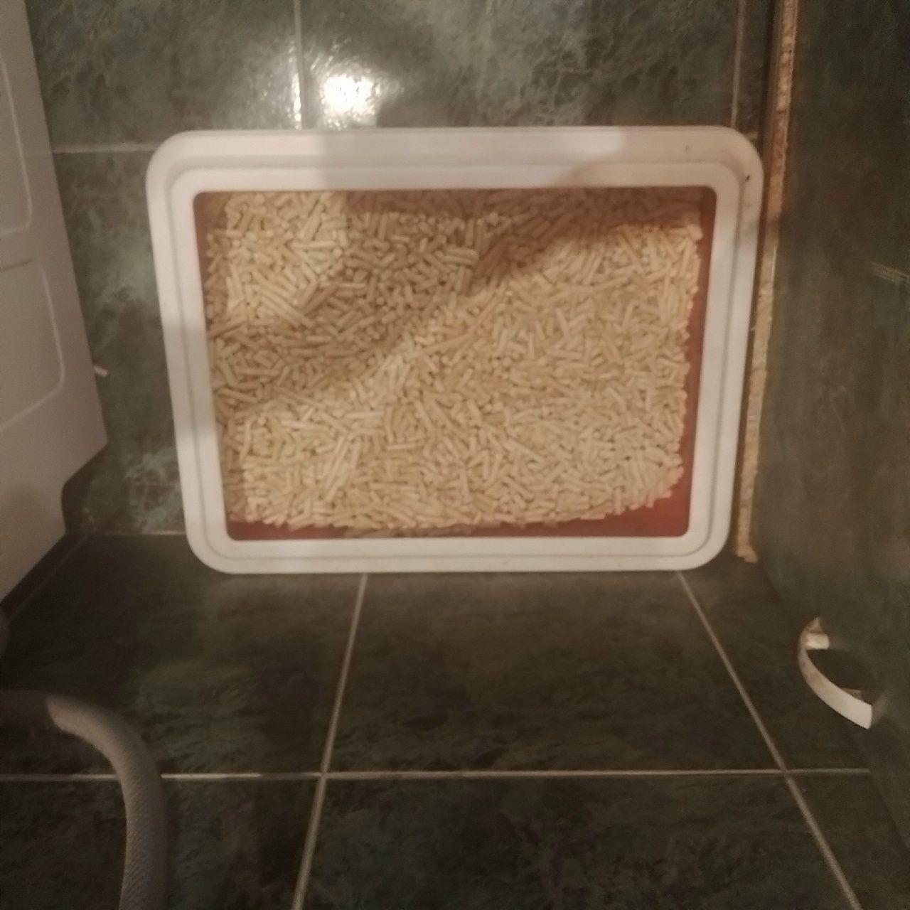 - Заполните сухой лоток наполнителем слоем 3-5 см