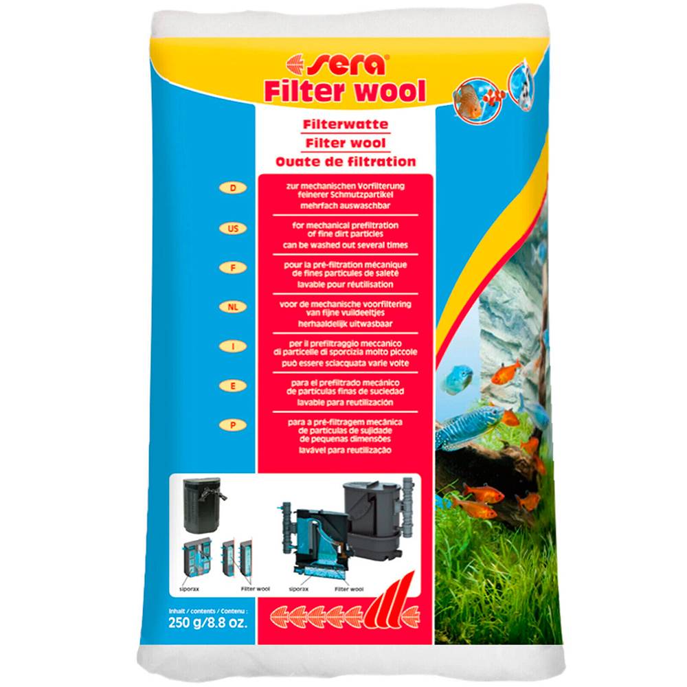 Sera наполнитель для фильтра filterwool фильтрующая вата способствует качественному удерживанию загрязнений на протяжении долгого времени. Применять можно многоразово, быстро промывается от грязи под проточной водой. Не выделяет токсичных веществ и является полностью безопасным для водных обитателей. Хорошо фильтрует пресную и морскую воду.