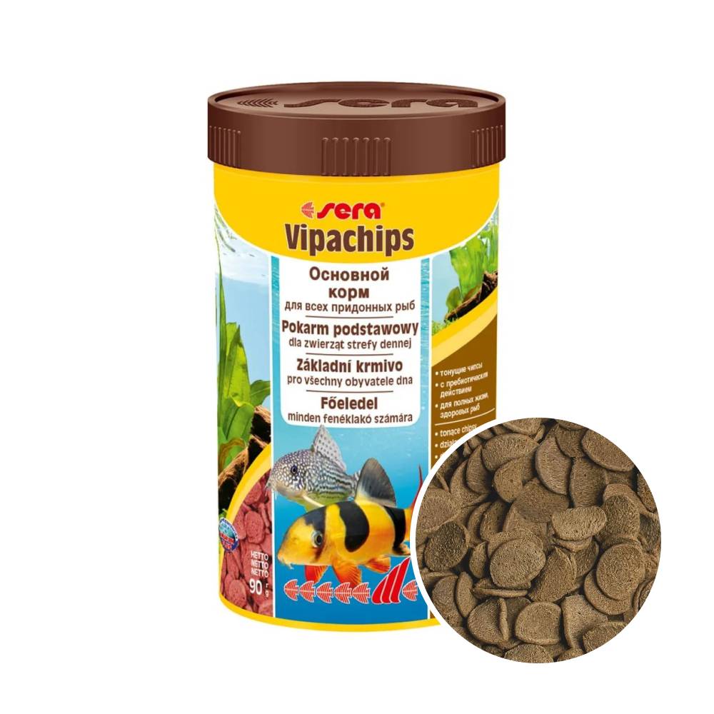 Корм Сера Випачипс 100 мл для придонных рыб состоит исключительно из натуральных продуктов. Питание имеет форму чипсов, которые легко тонут в воде. Корм может использоваться в качестве полноценного основного питания для всевозможных видов рыб, включая растительноядных и тех, которые принимают пищу у дна.