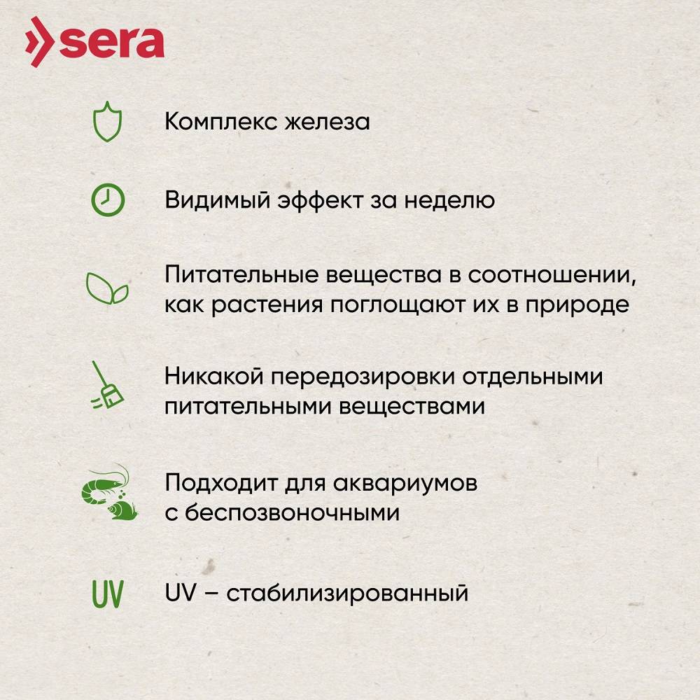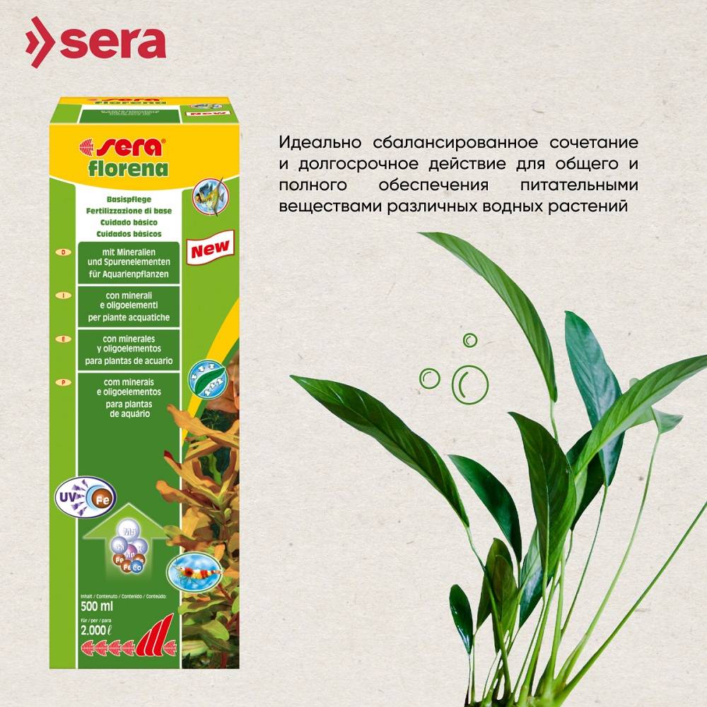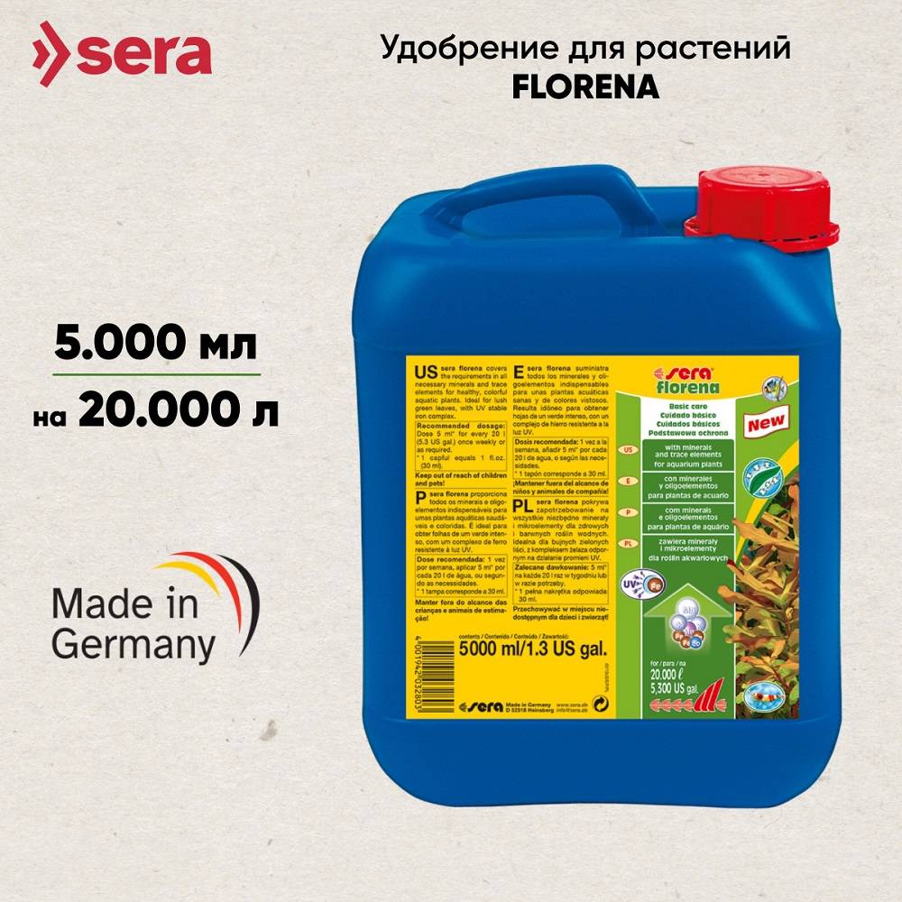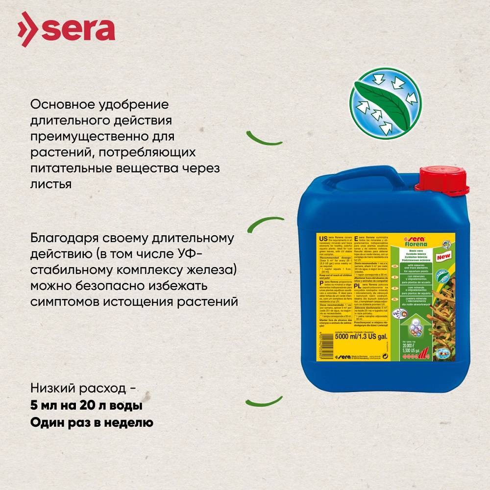 Sera флорена идеальный продукт по уходу за теми аквариумными растениями, которые потребляют питательные вещества в основном через листья. Водные растения очень важны для аквариумистов, так как они потребляют из воды продукты обмена веществ рыб и питательные вещества, которые вызывают бурное развитие нежелательных водорослей. sera флорена обеспечивает аквариумные растения всеми необходимыми минералами и микроэлементами для здорового и пышного роста, благодаря чему растения могут выполнить эту задачу. В результате избегаются проявления недостатка веществ без излишнего обременения воды переизбытком питательных веществ. Новая улучшенная формула содержит инновационные, особенно стабильные хелатные комплексы железа, которые остаются доступны даже при ежедневном использовании УФ-стерилизаторов. Продукт не содержит ни нитратов ни фосфатов. Он безопасен для всех беспозвоночных. Комбинация sera флорена и sera флоренетте (sera florenette) отлично сбалансирована и оптимально соответствует всем требованиям.
