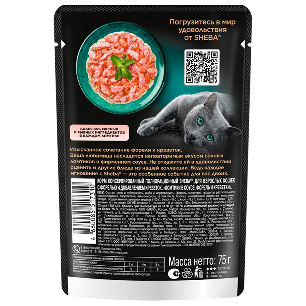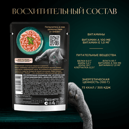 Ломтики с нежной форелью и ароматными креветками в фирменном соусе – блюдо из высококачественных ингредиентов, которое придётся по вкусу самым притязательным кошкам.