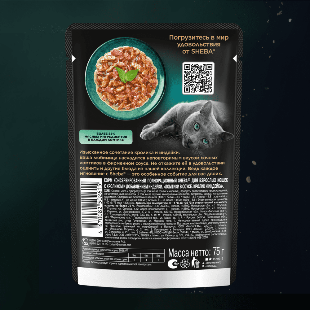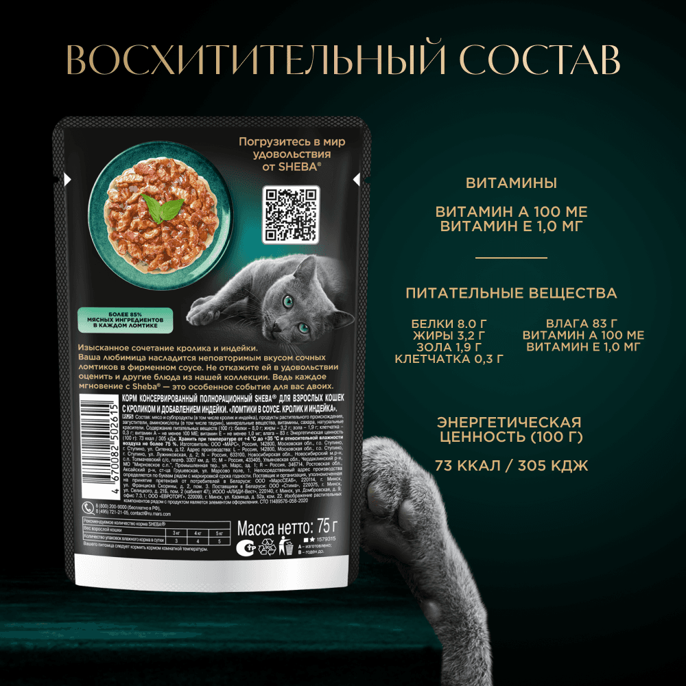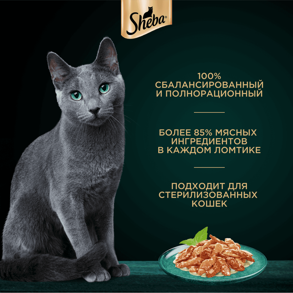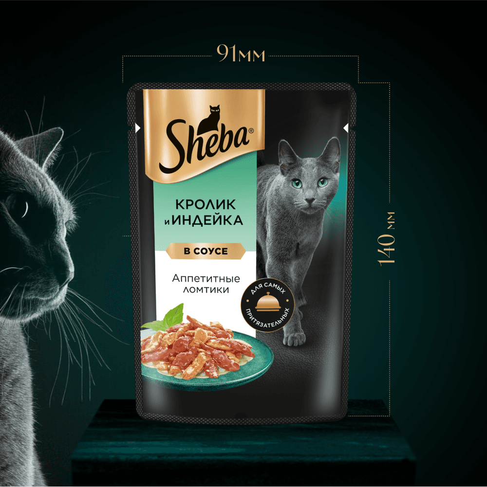 Сочные ломтики "кролик и индейка" в ароматном соусе - блюдо из высококачественных ингредиентов, которое придётся по вкусу самым притязательным кошкам. Мы приготовили его по особому рецепту, чтобы раскрыть всю красоту вкуса и сохранить баланс витаминов, минералов и аминокислот, необходимых вашей любимице. Подарите своей кошке особое удовольствие, побаловав ее всеми блюдами из коллекции SHEBA®.