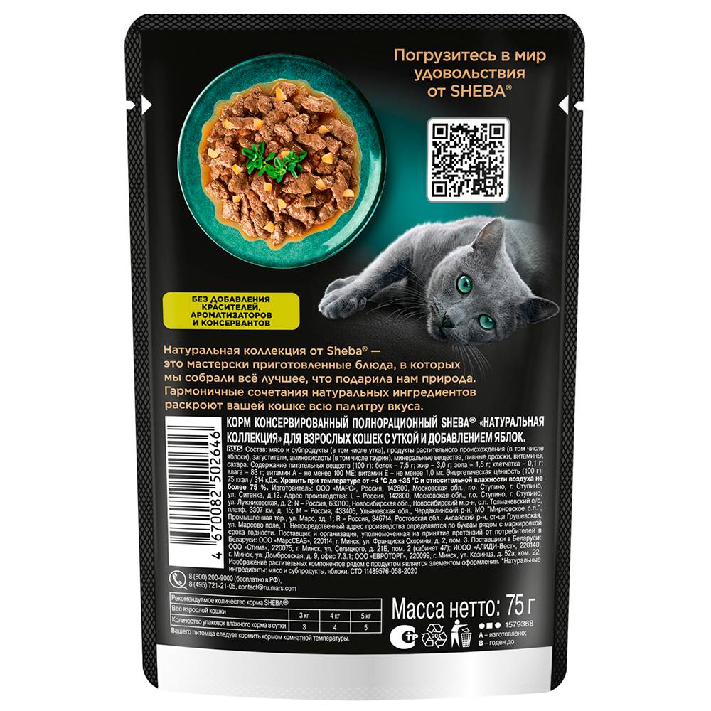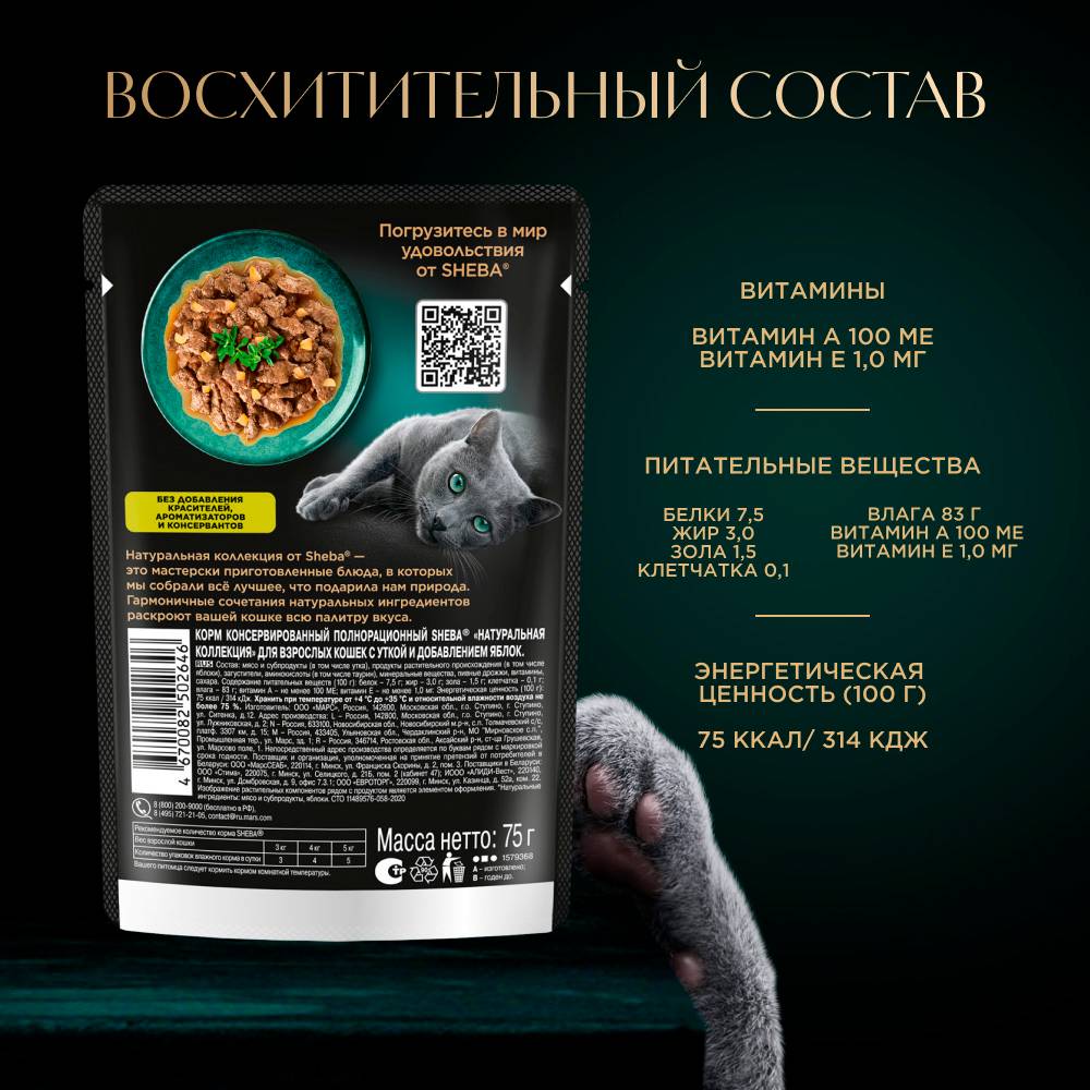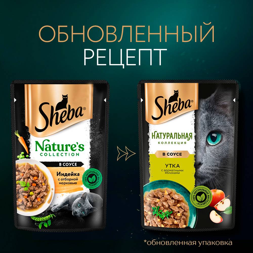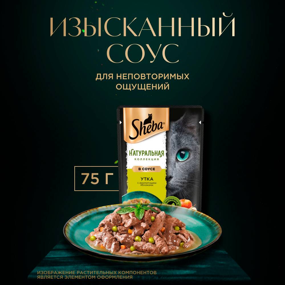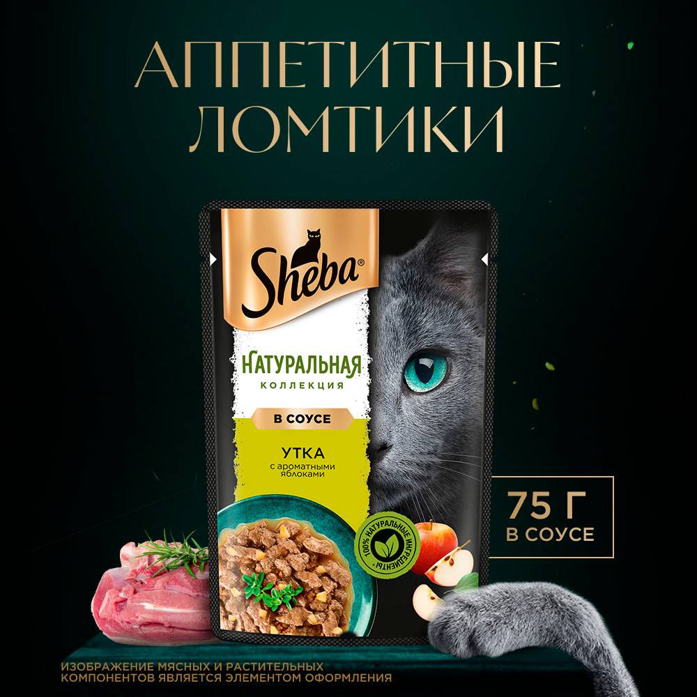 Влажный корм SHEBA® линейки «НАТУРАЛЬНАЯ КОЛЛЕКЦИЯ» с уткой и добавлением яблок - блюдо из высококачественных ингредиентов, которое придётся по вкусу самым притязательным кошкам. Мы приготовили его по особому рецепту, чтобы раскрыть всю красоту вкуса и сохранить баланс витаминов, минералов и аминокислот, необходимых вашей любимице. Подарите своей кошке особое удовольствие, побаловав ее всеми блюдами из "НАТУРАЛЬНОЙ КОЛЛЕКЦИИ" SHEBA®.