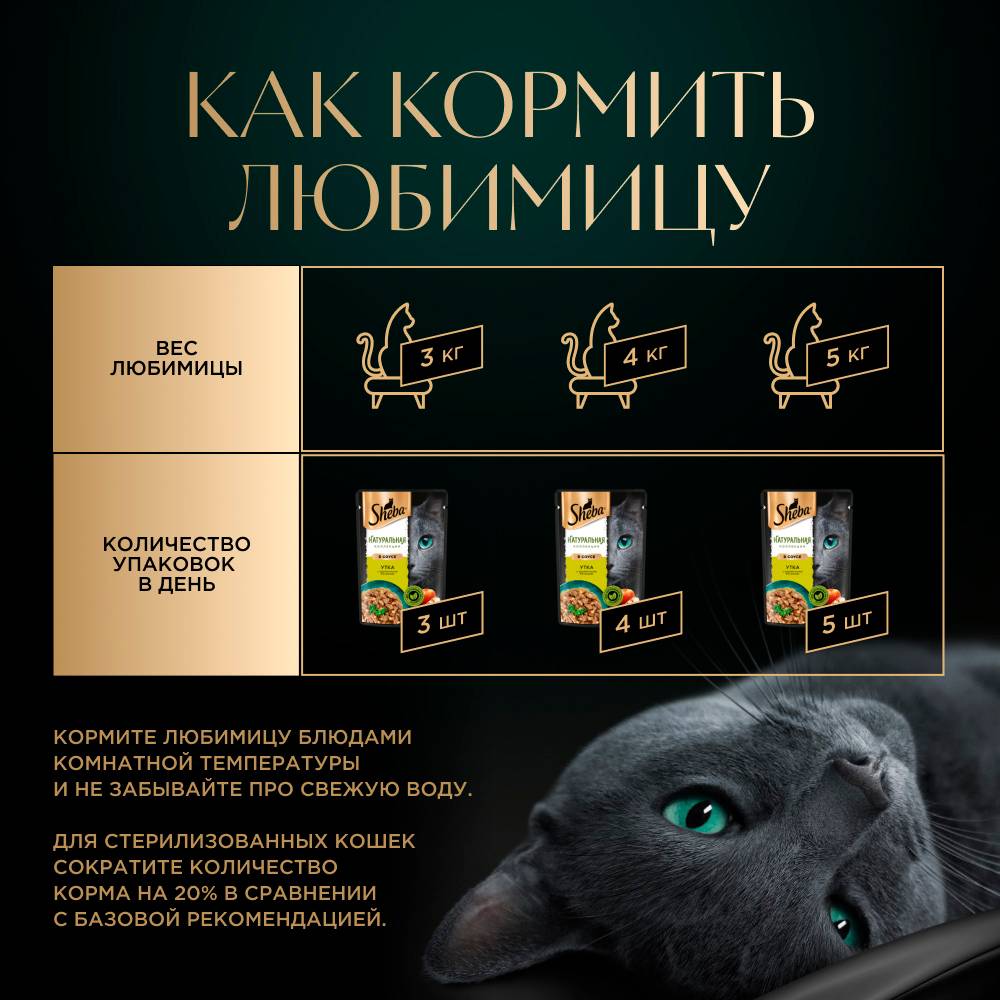 Для взрослой кошки среднего веса (4 кг) необходимо 3,5 - 4,5 пакетика в день. Вашу кошку следует кормить продуктом комнатной температуры.