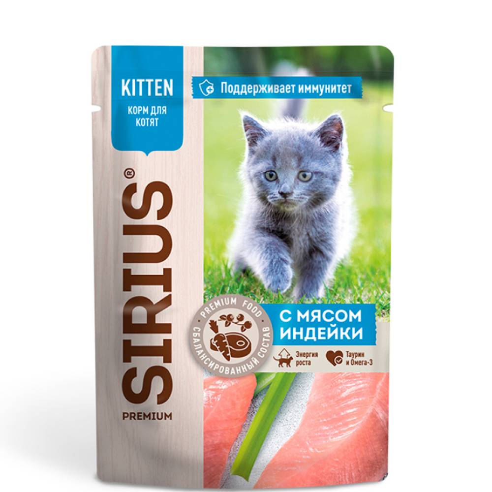 SIRIUS — влажный корм премиум-класса для полноценного ежедневного рациона котят с 1-2-х месяцев до 1 года. Высококачественный продукт создан специально для маленьких питомцев. Корм содержит натуральные ингредиенты, а также все необходимые микроэлементы и витамины, которые нужны для здоровья, роста и развития котенка.
