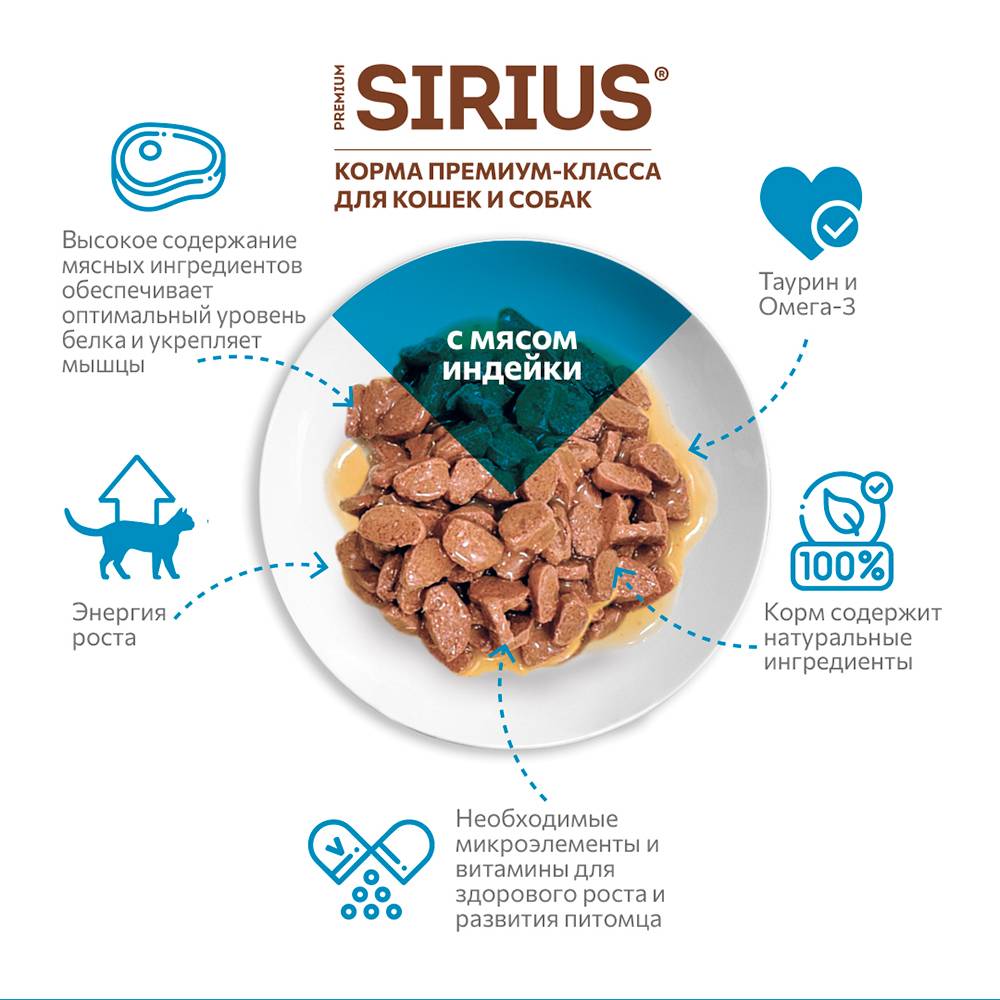 SIRIUS — влажный корм премиум-класса для полноценного ежедневного рациона котят с 1-2-х месяцев до 1 года. Высококачественный продукт создан специально для маленьких питомцев. Корм содержит натуральные ингредиенты, а также все необходимые микроэлементы и витамины, которые нужны для здоровья, роста и развития котенка.