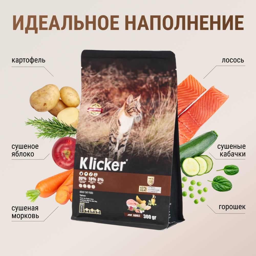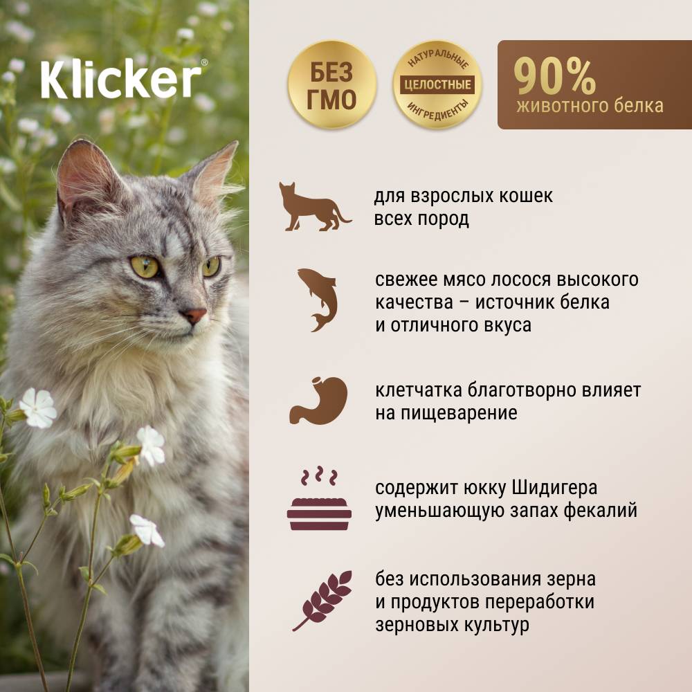 Корм Klicker с лососем для взрослых кошек – это полнорационный сухой рацион класса холистик, который ваш усатый питомец будет есть с удовольствием и пользой для здоровья. Корм приготовлен из свежей и сушеной рыбы высокого качества с добавлением овощей, фруктов и необходимых натуральных добавок.