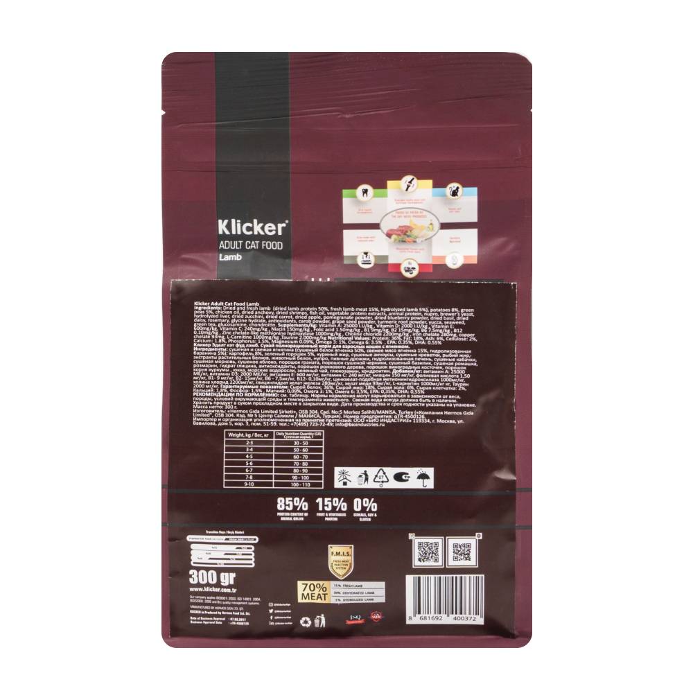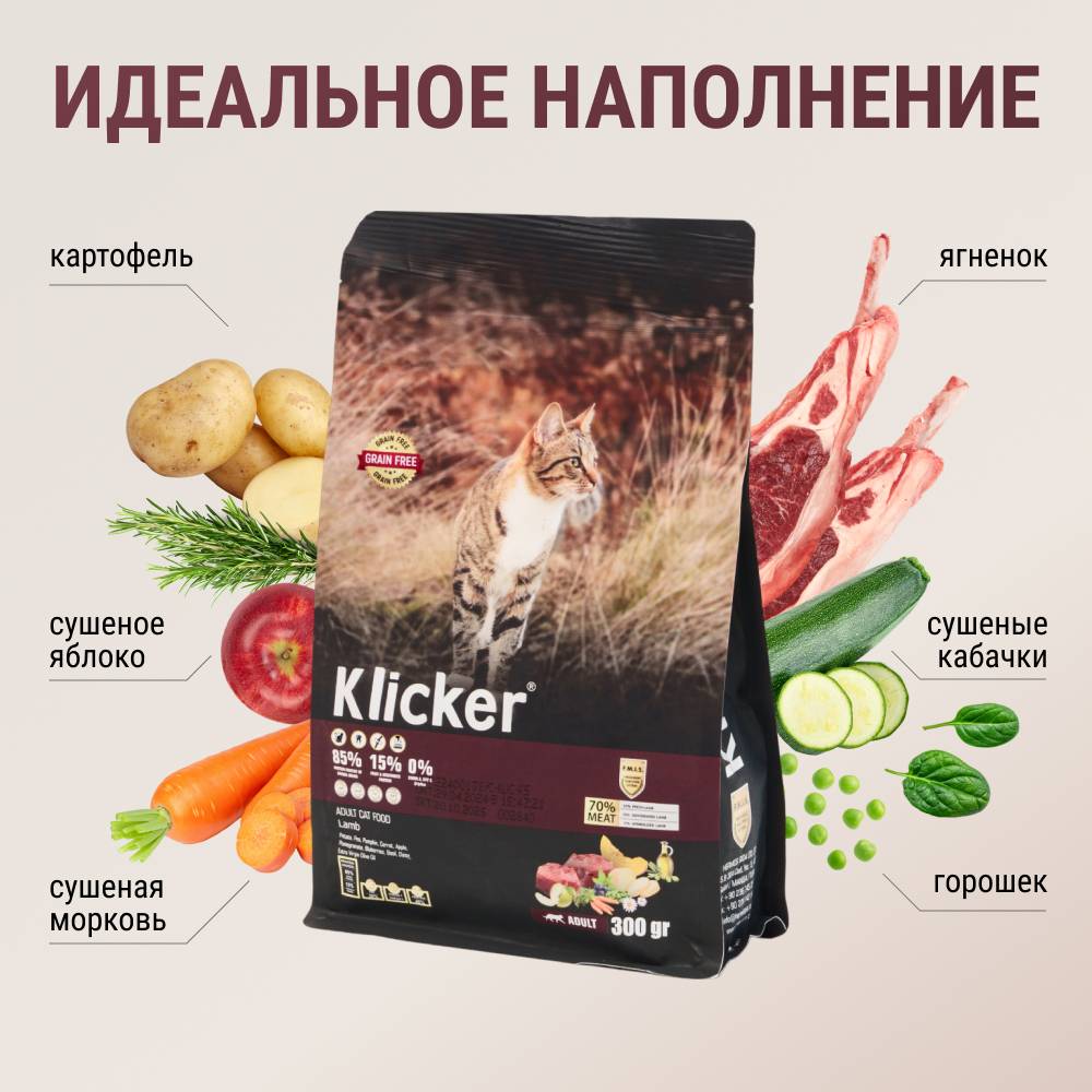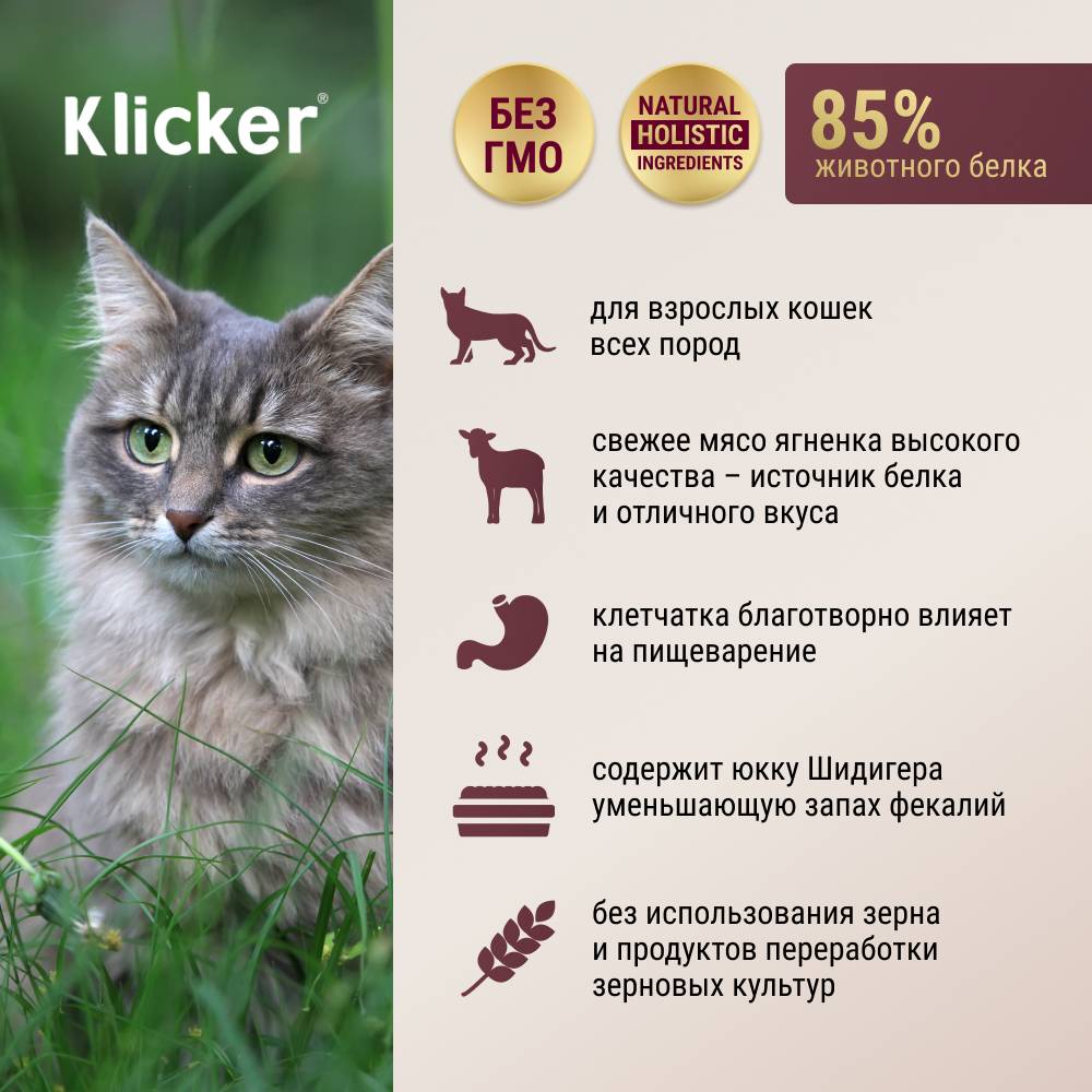 Klicker Adult Cat Food Hypoallergenic с ягненком для взрослых кошек склонных к пищевой аллергии – это полнорационный сухой корм класса холистик, приготовлен с использованием системы впрыска свежего мяса, это технология которая делает его еще более аппетитным для вашего питомца.