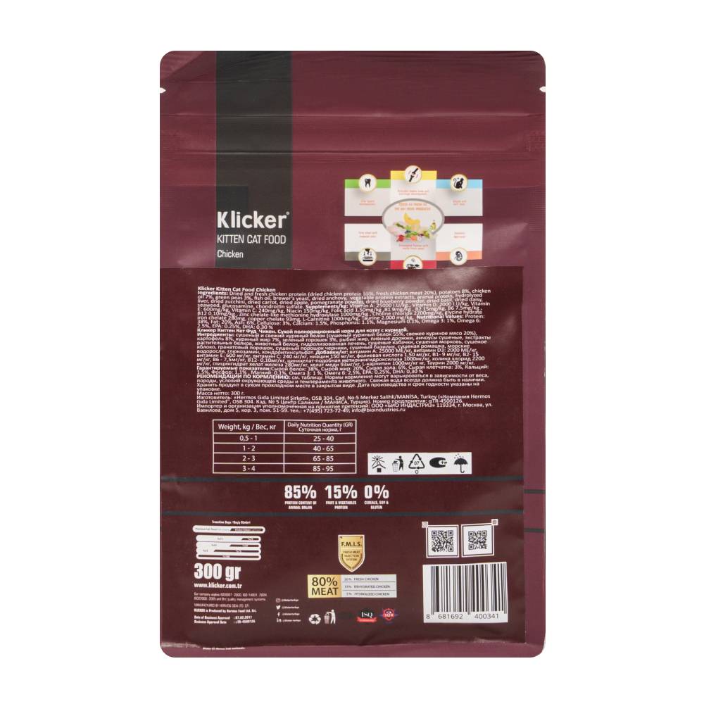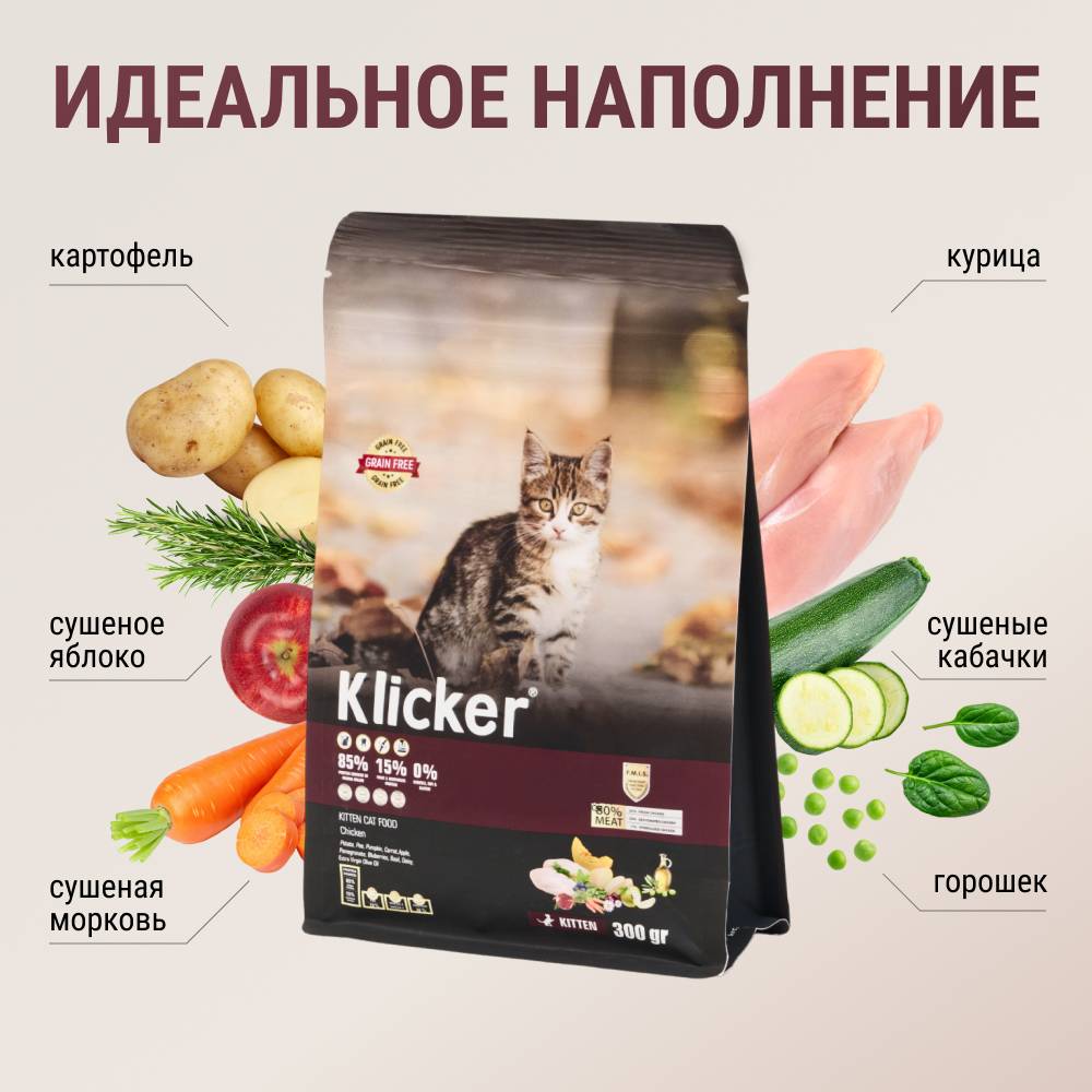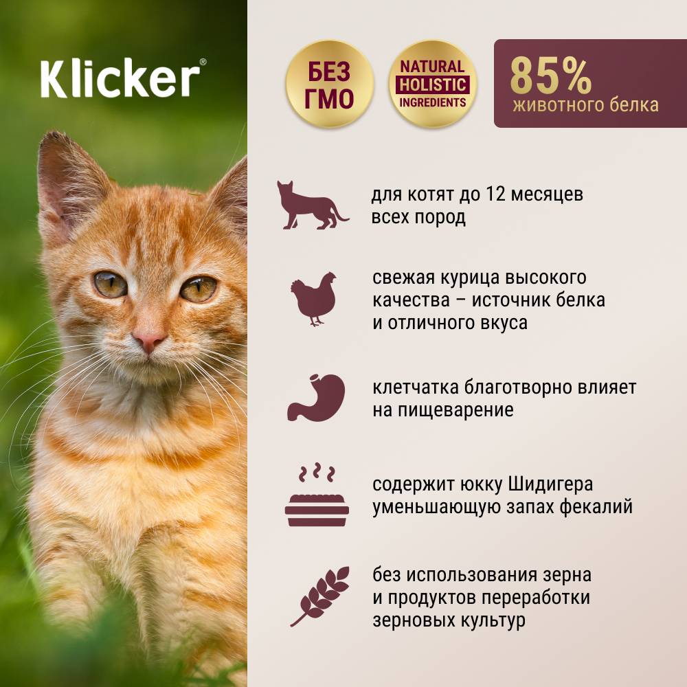 Корм Klicker с курицей для котят – это полнорационный сухой рацион класса холистик, который ваш усатый малыш будет есть с удовольствием и пользой для роста и развития. Корм приготовлен из мяса цыпленка отборного качества с добавлением овощей, фруктов и необходимых натуральных добавок.