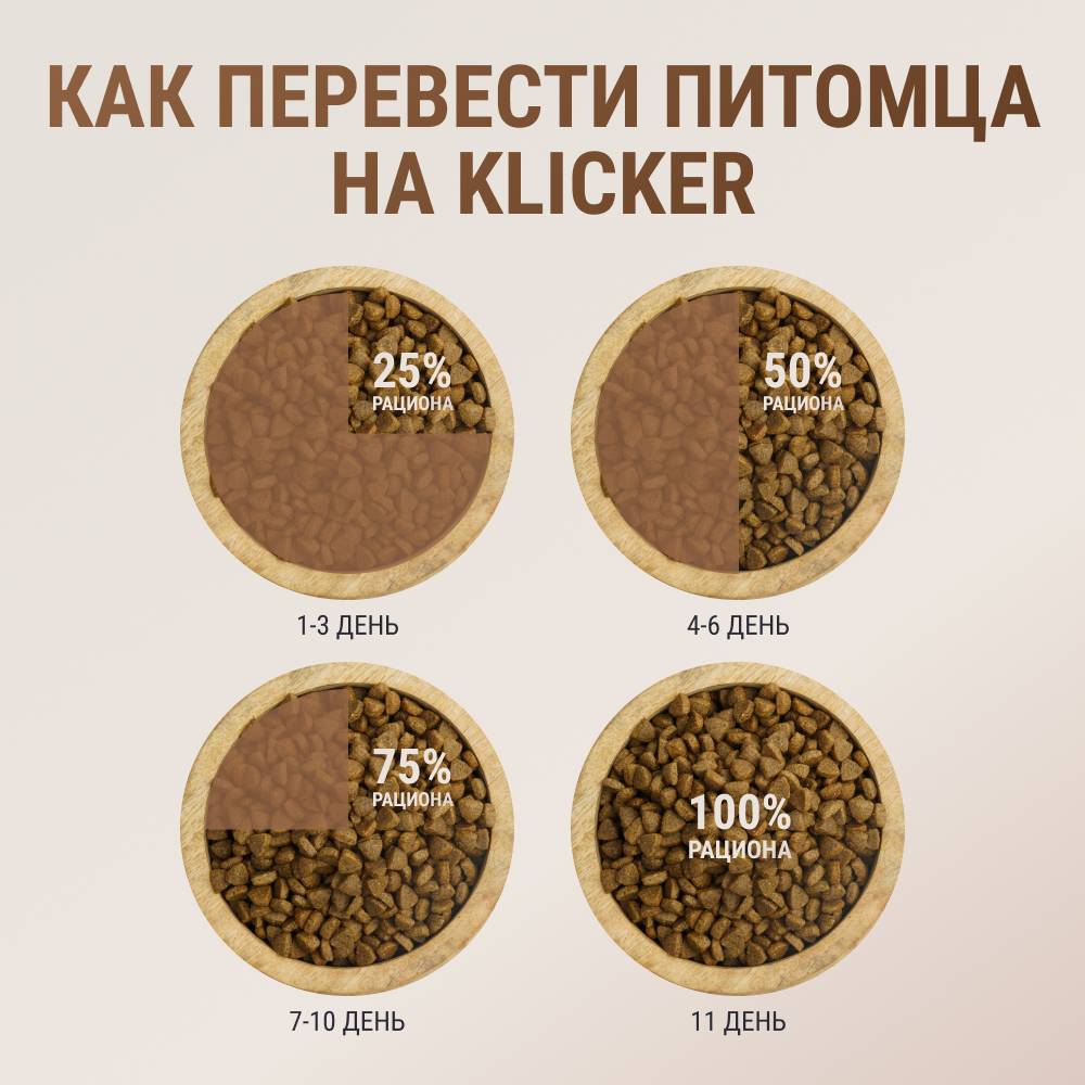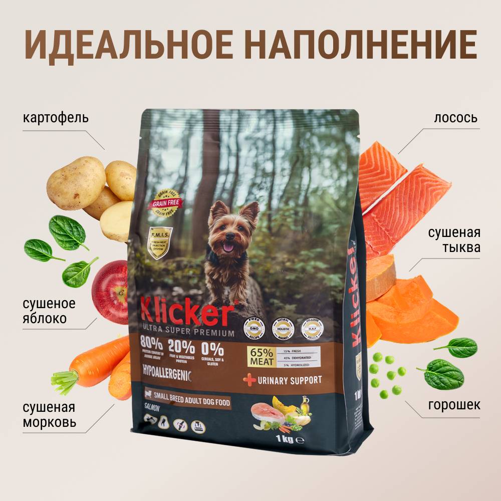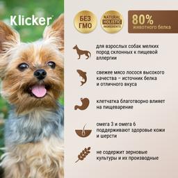 Klicker Adult Small Hypoallergenic с лососем для взрослых собак мелких пород склонных к пищевой аллергии – это полнорационный сухой корм класса холистик, приготовлен с использованием системы впрыска свежего мяса, это технология которая делает его еще более аппетитным для вашего питомца.
