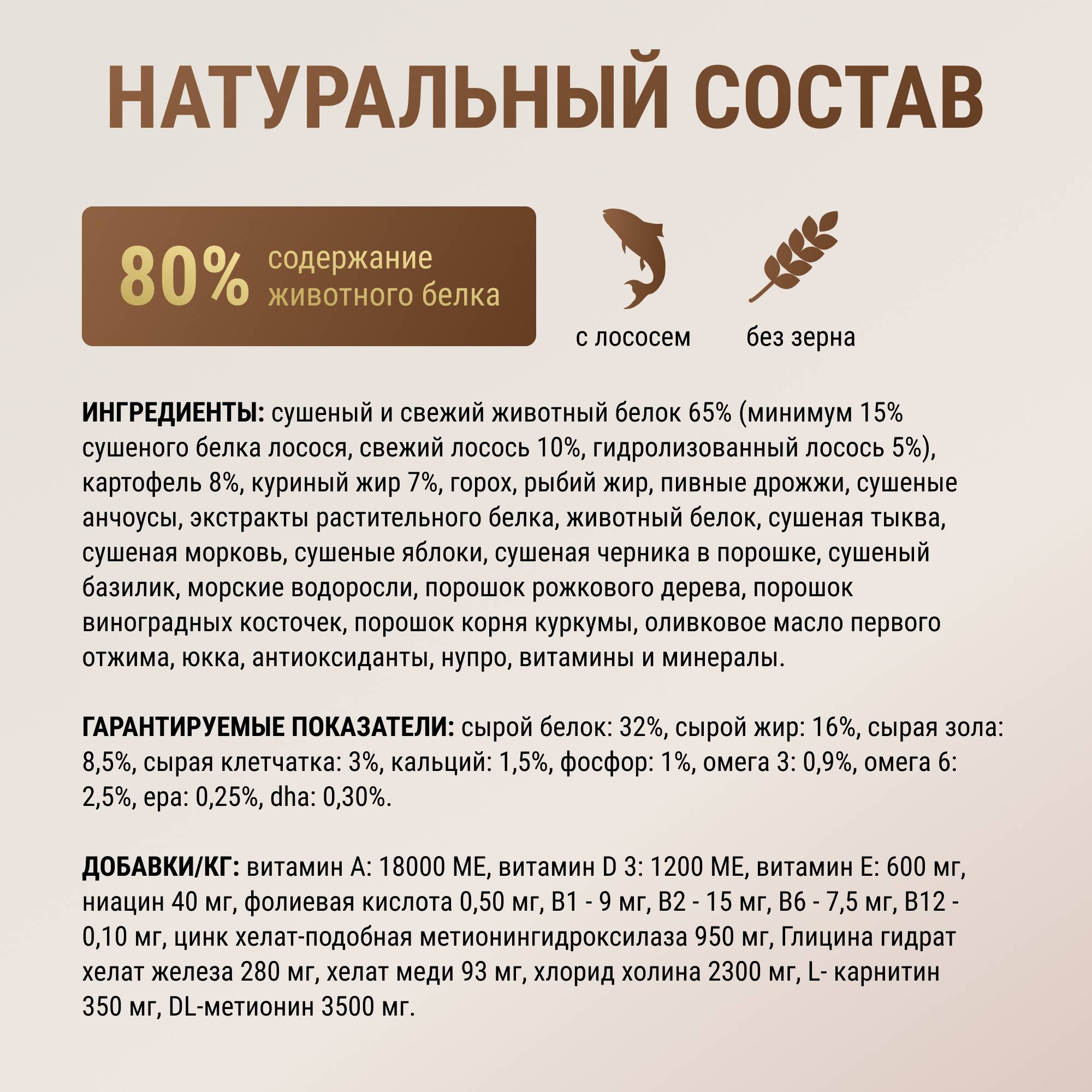 - Приготовлен из свежего мяса лосося с добавлением сушеных овощей и витаминно-минеральных комплексов;