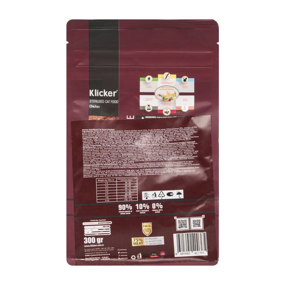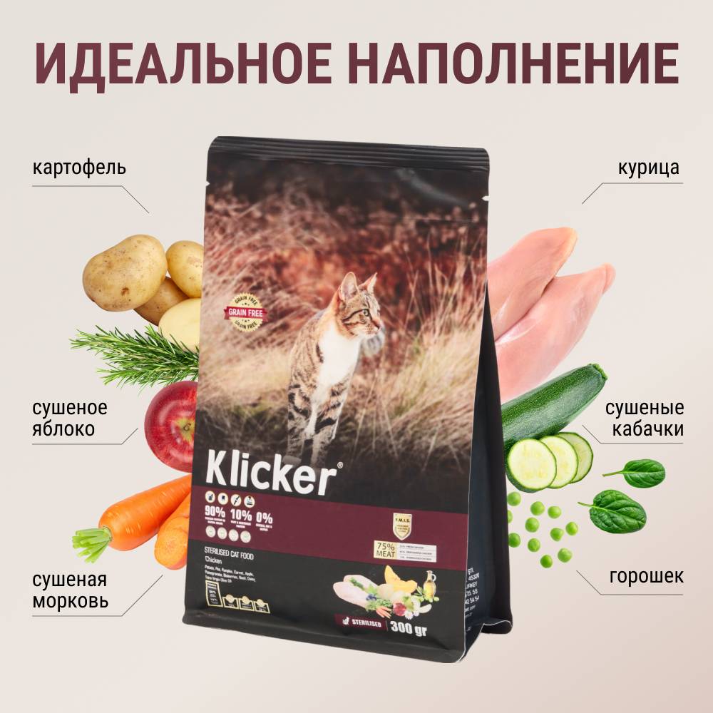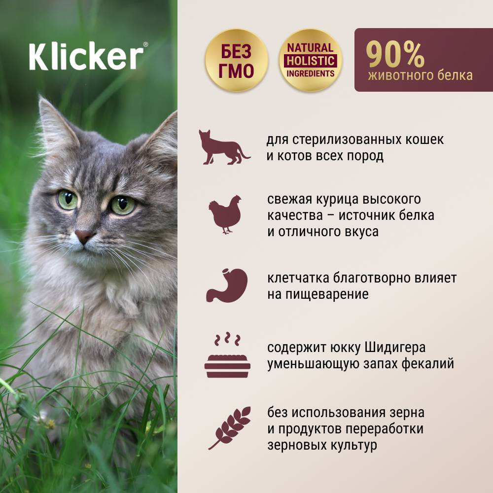 Корм Klicker с курицей для стерилизованных кошек и кастрированных котов – это полнорационный сухой рацион класса холистик, который ваш усатый питомец будет есть с удовольствием и пользой для здоровья. Корм приготовлен из курицы высокого качества с добавлением овощей, фруктов и необходимых натуральных добавок.