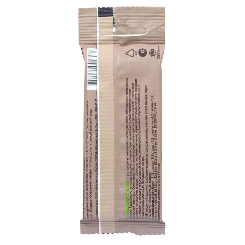 Гематоген мясной – это профилактическое лакомство для собак, обогащенное комплексом витаминов. Разработано на основе классической рецептуры гематогена с учетом физиологических особенностей животных. Не содержит сахара. Стимулирует образование эритроцитов, повышает содержание гемоглобина в крови, обогащает организм железом, нормализует обмен веществ, содержит белки, жиры и углеводы в легкоусвояемой форме, рекомендуется включать в рацион ослабленных и перенесших операции собак.