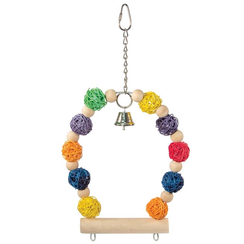 Игрушка для птиц в виде качелей с плетеными и деревянными шариками. Преимущества: Крепление: карабин. Размер: 230/350*180 мм. Материал/состав: дерево, металл, плетеные шары