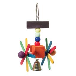 - Игрушка для птиц в виде подвески с цветными бусинами и деревянными вертушками по бокам, с колокольчиком.