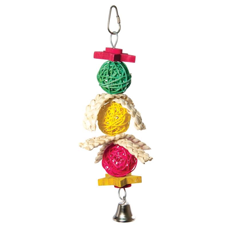 - Игрушка для птиц в виде трех плетеных шариков, двух деревянных звезд и колокольчика.