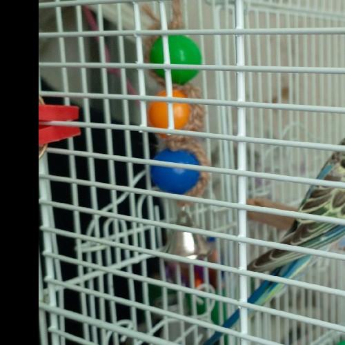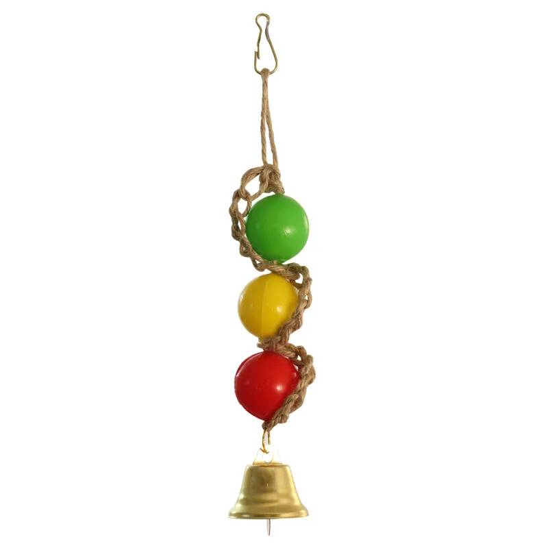 - Игрушка для птиц - подвеска в виде 3ех ярких шариков на джутовой веревке с колокольчиком.