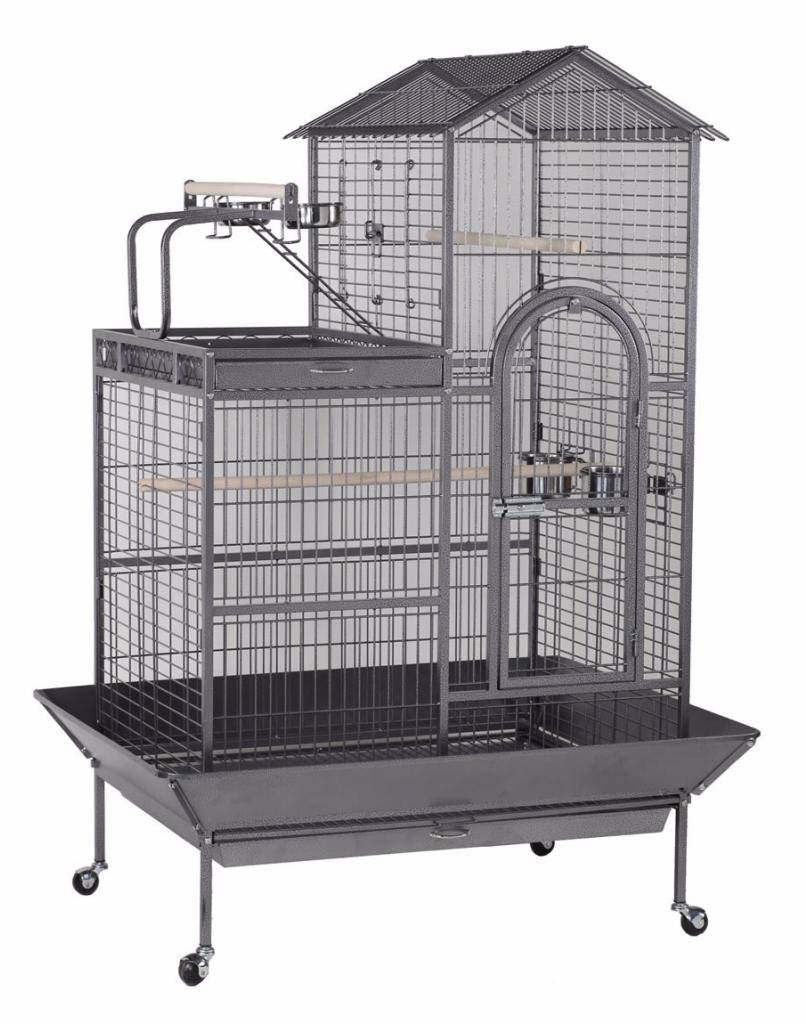 Комплектация: 4 металлических мисок-кормушек с устройством "АНТИСБРОС", решетка на дне, фартук (для защиты от мусора), 3 жердочки, оснащена удобными колесами для перемещения, удобный замок на дверце клетки с устройством предотвращающим открытие дверцы детьми, попугаями и пр.