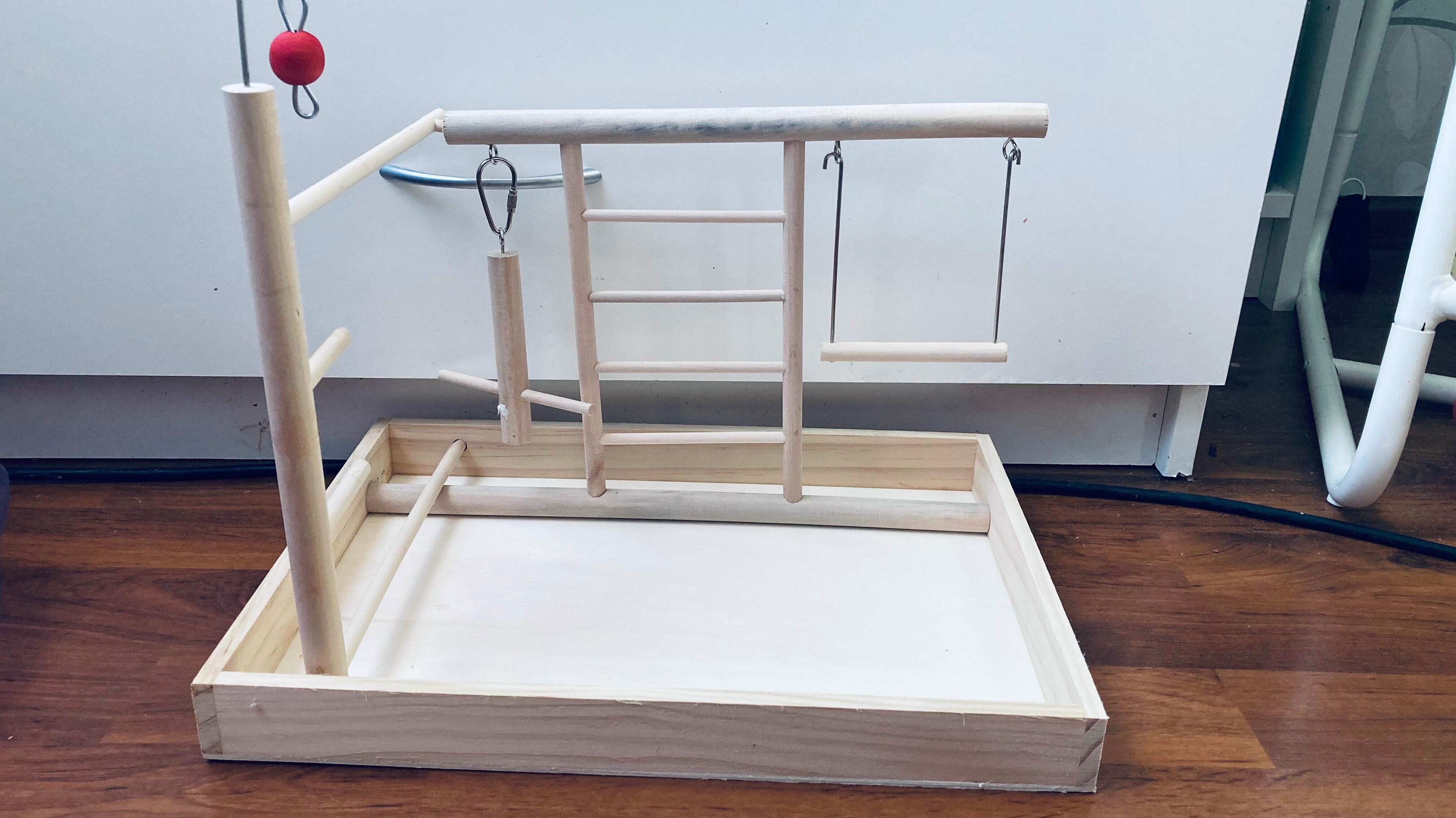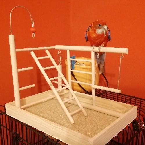 Площадка хорошая база для игр и отдыха. Легкая, компактного размера. Есть запах дерева. Детали самой конструкции хорошо бы дополнительно скреплять клеем. Отлично подойдет для мелких птиц. На площадку повесили еще и свои игрушки. Волнистый попугай пока ее боится, но за вкусняшкой спокойно садиться на жердочку.федя
