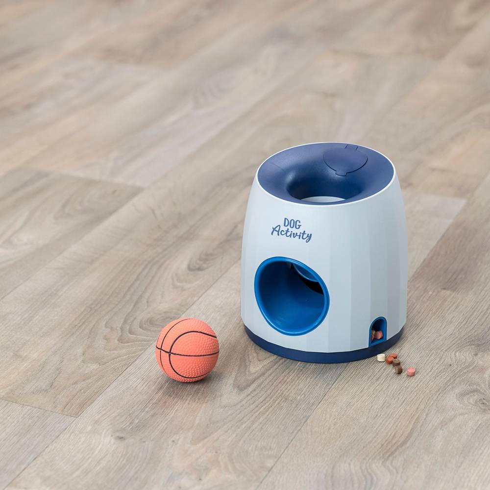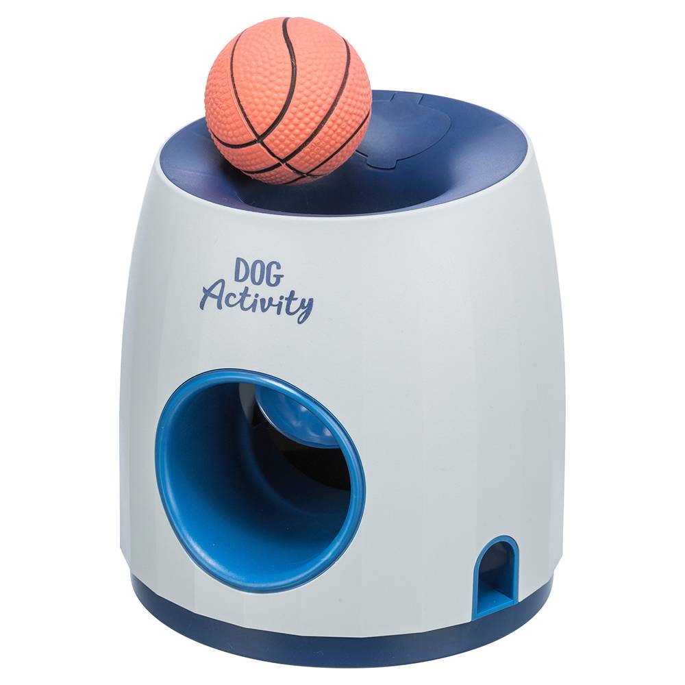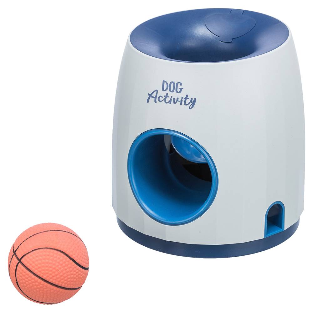 Развивающая игрушка для собак. Представляет собой устойчивую корзину, при опускании мячика в которую, с двух сторон будет высыпаться немного корма. Корпус выполнен из пластика. Подходит для сухого корма, диаметр которого не превышает 15 мм.