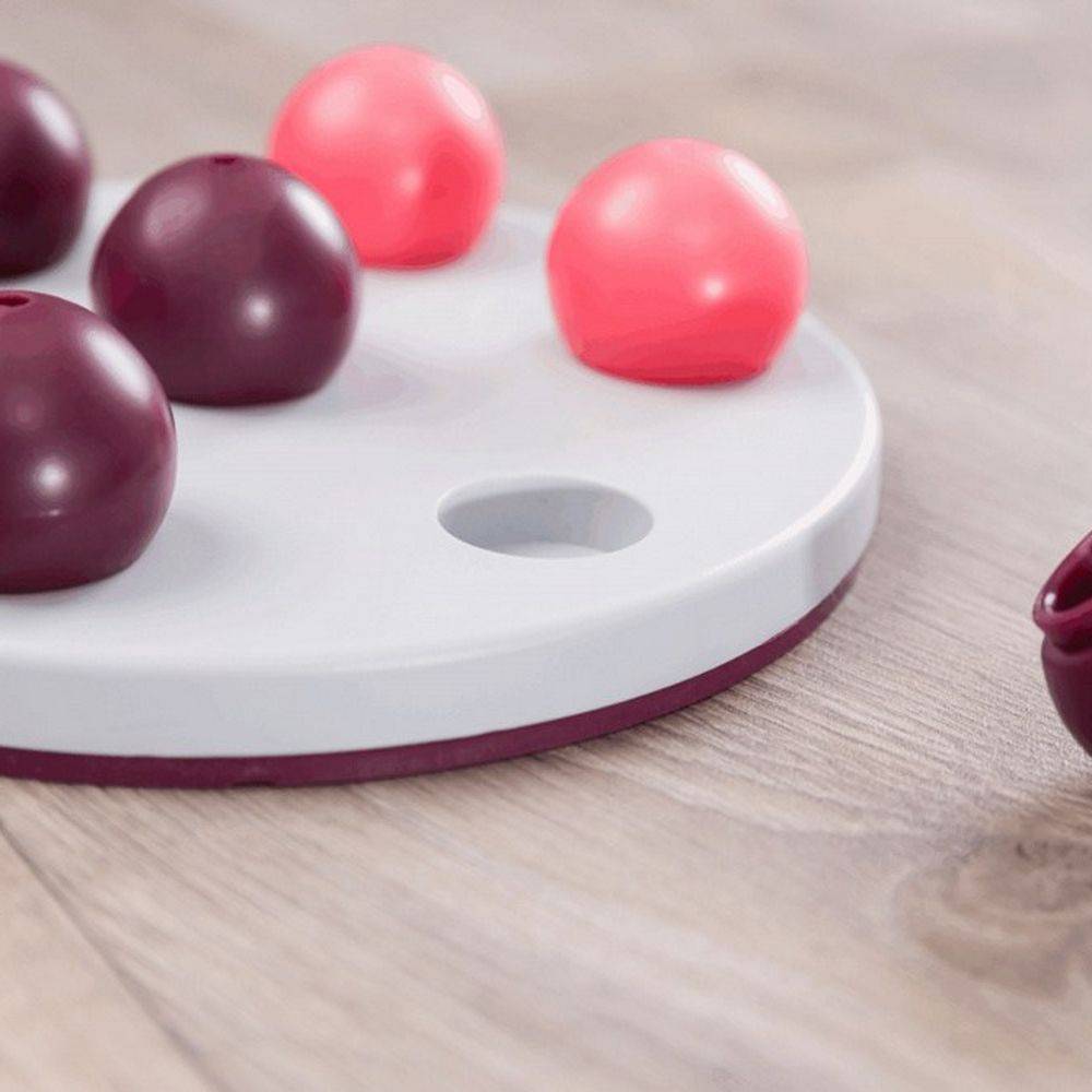 - Теперь кошке нужно пытаться лапой снять шарообразную крышку, чтобы получить угощение. Если у нее не получится несколько раз подряд, помогите ей – накройте углубление крышкой только наполовину.