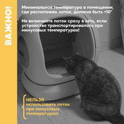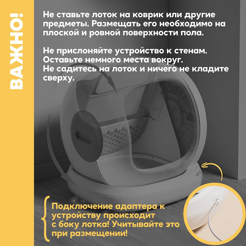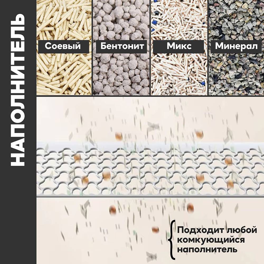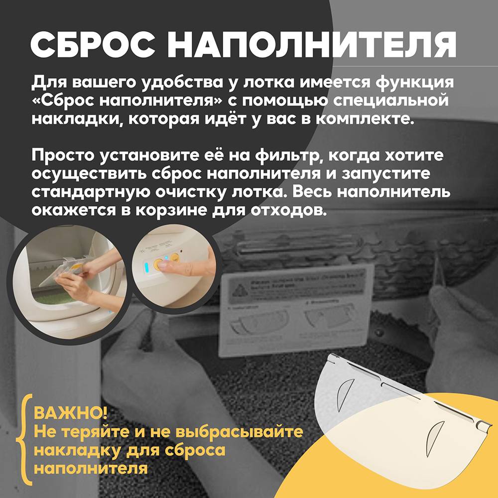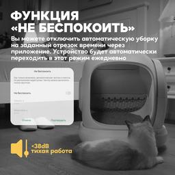 Бесшумная работа.Чтобы не нарушать ваш привычный комфорт, уровень шума работы лотка составляет до 38 дБ. Это на столько тихо, что вы услышите только пересыпание наполнителя при уборке.