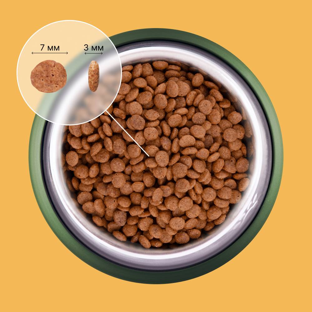 Очень мелкий, то что нужно котёнку. От этого корма котёнок сыт дольше, чем от того которым питался раньше.