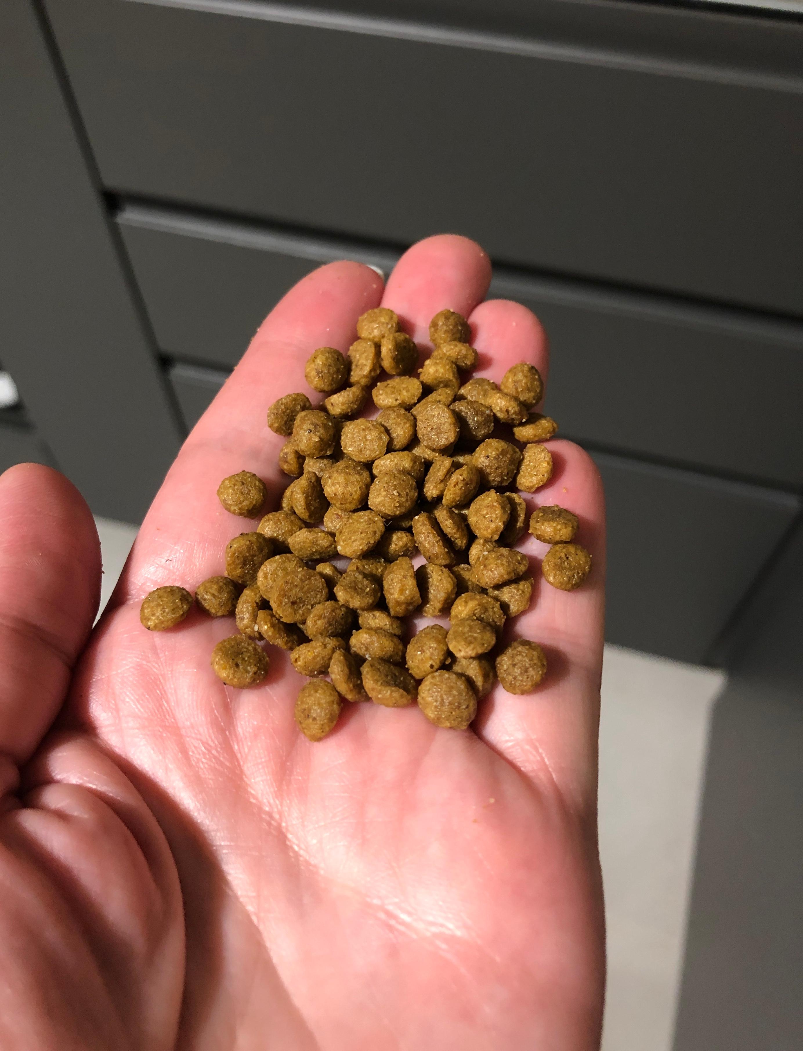 Котёнок ест с удовольствием. Гранулы довольно мелкие, не крошатся. Даём объем по рекомендации к возврату и весу. Съедает всё до последней крошки.Комментарий