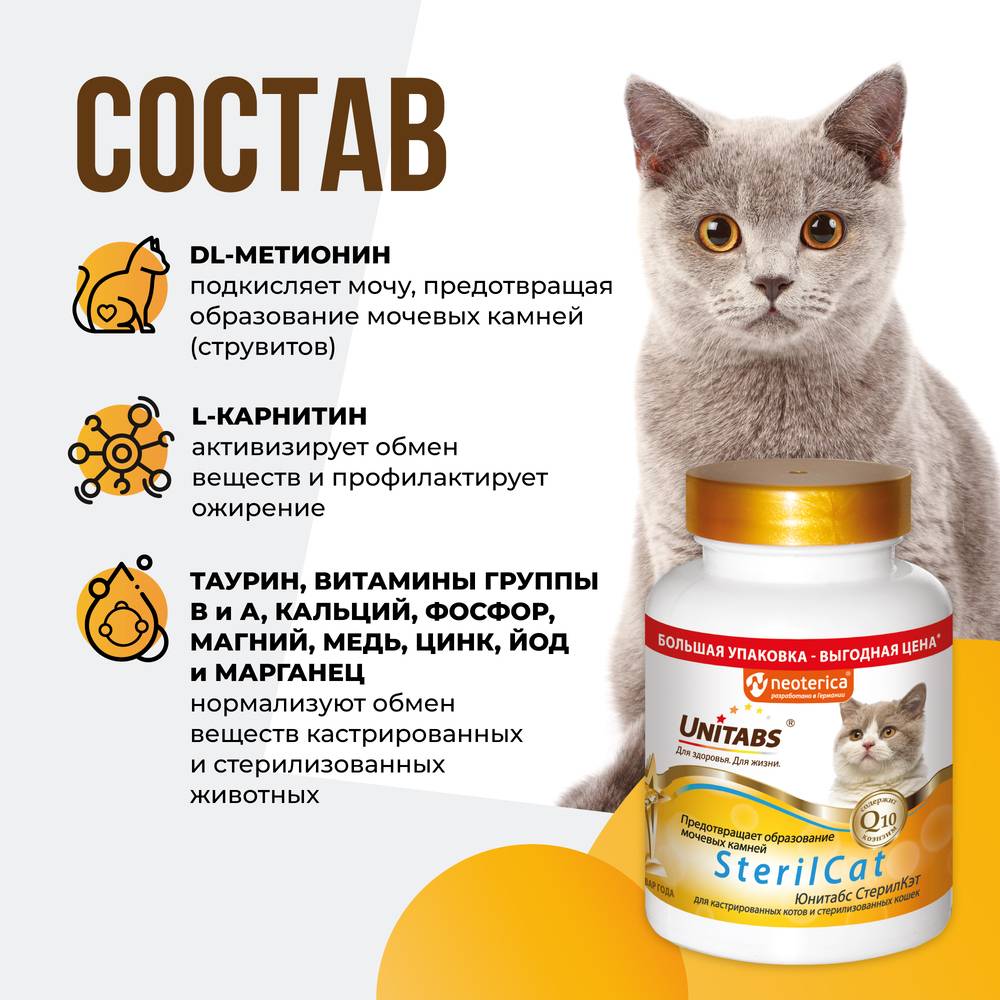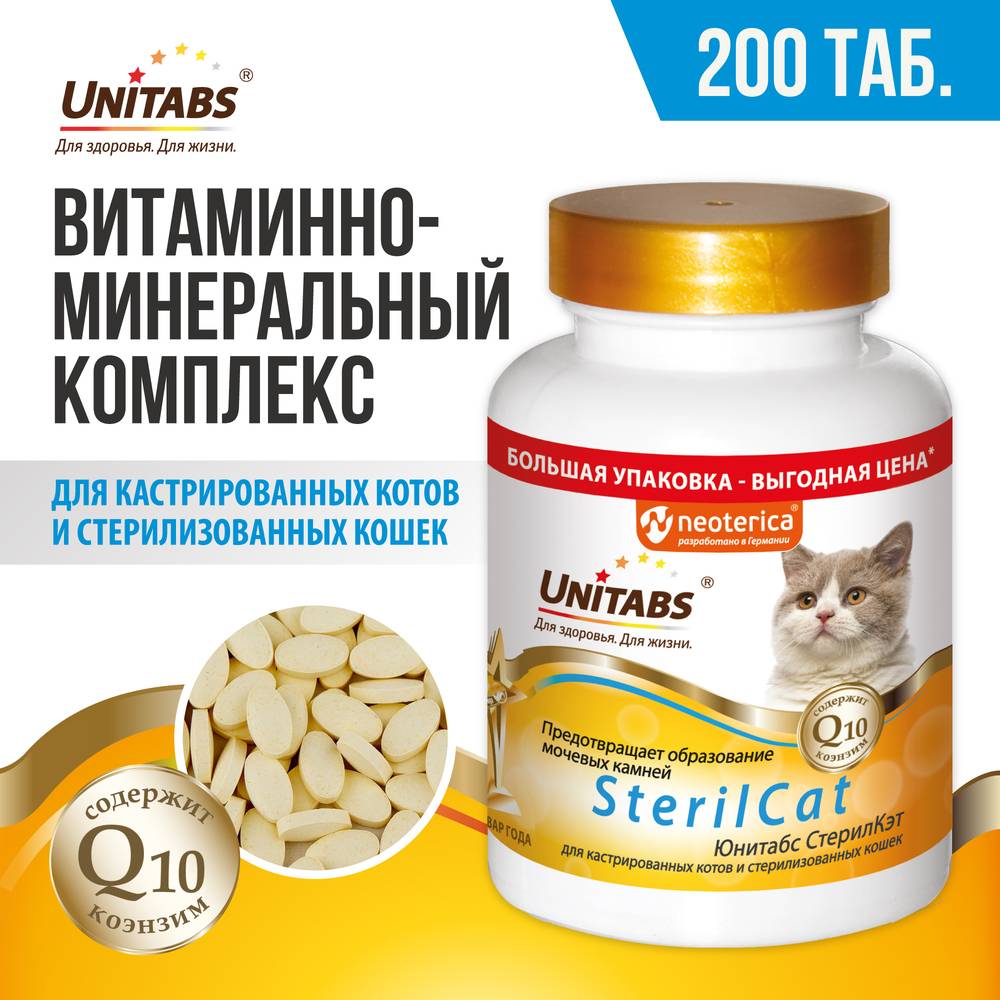 Unitabs SterilCat — это витаминно-минеральный комплекс для кошек любого возраста и породы, который содержит коэнзим Q10 и все необходимые витамины, макро- и микроэлементы для нормализации обмена веществ и укрепления иммунитета. Молочный вкус и запах витаминок придутся по душе привередливым кошкам.