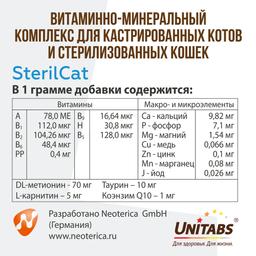 Unitabs SterilCat сбалансирована с учётом суточной потребности в витаминах, макро- и микроэлементах, необходимых для кастрированных котов и стерилизованных кошек старше 8-месячного возраста.