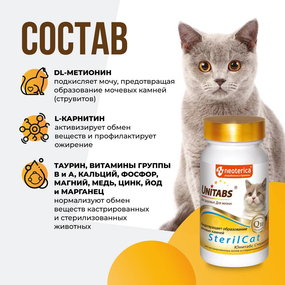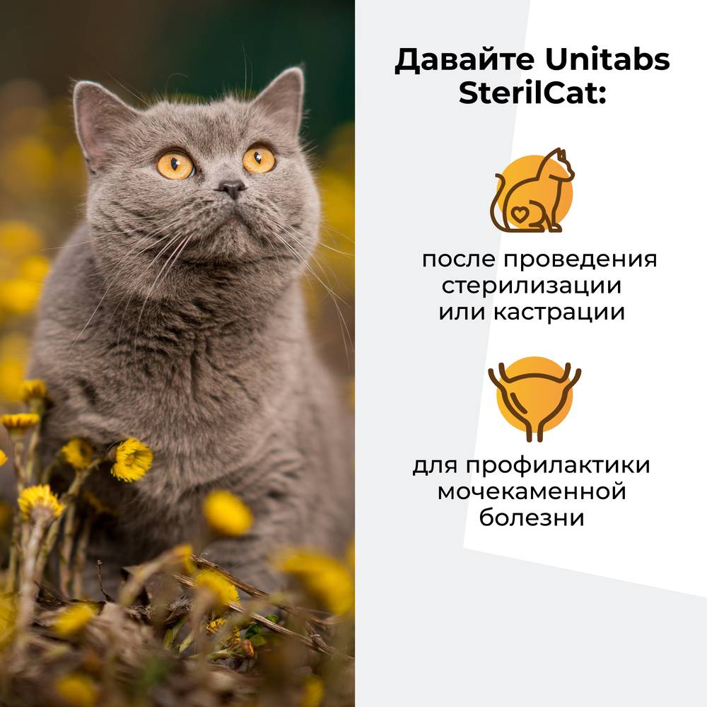 Витаминно-минеральная добавка UNITABS STERILCAT сбалансирована с учетом суточной потребности в витаминах, макро- и микроэлементах, необходимых для кастрированных котов и стерилизованных кошек старше 8-месячного возраста. Оптимальное соотношение витаминов и макро- и микроэлементов обеспечивает нормализацию и улучшение метаболизма в организме кастрированных и стерилизованных животных, предотвращает рабочую нагрузку на мочевыделительную систему и образование мочевых камней (струвитов).