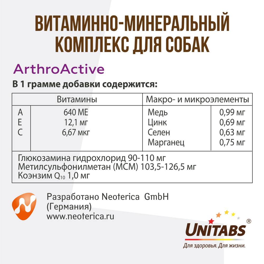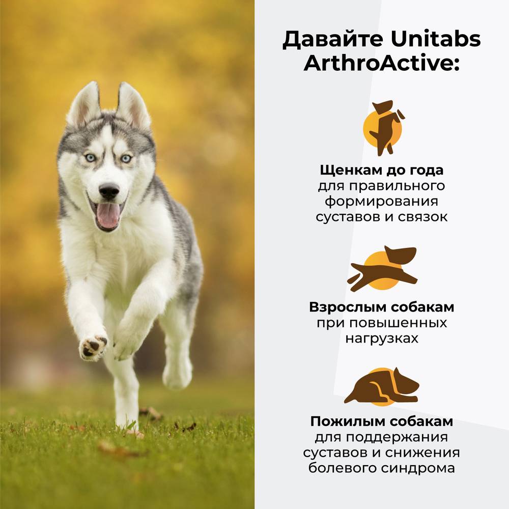 Юнитабс АртроАктив применяют для поддержания функции суставов и хрящей у собак крупных пород с 3-месячного возраста, у пожилых собак, у собак, имеющих лишний вес.