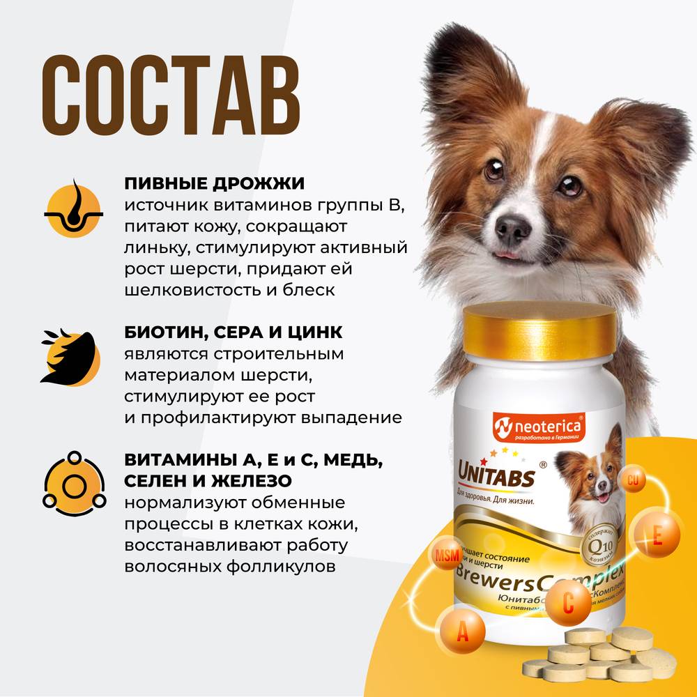 - Юнитабс БреверсКомплекс применяется для улучшения состояния кожи и шерсти у собак.