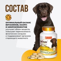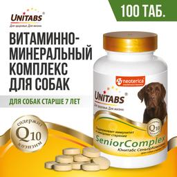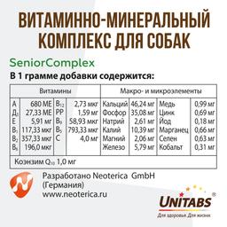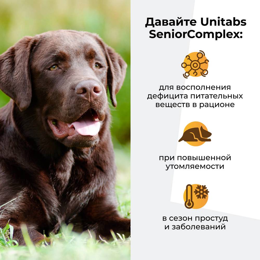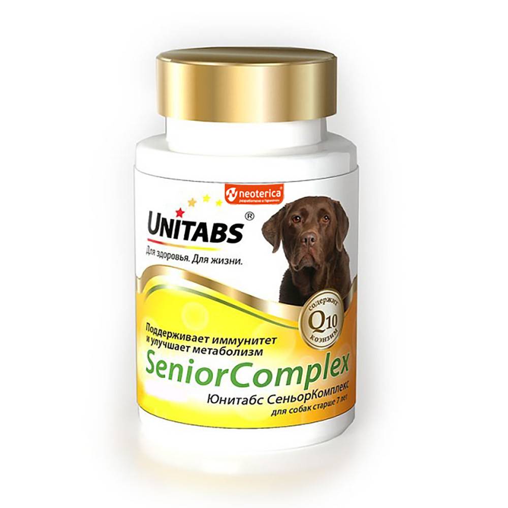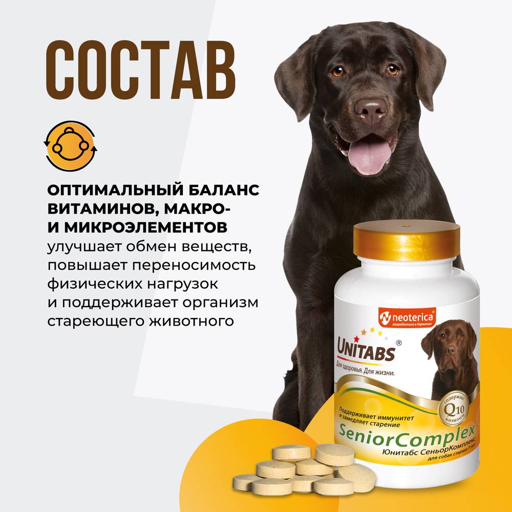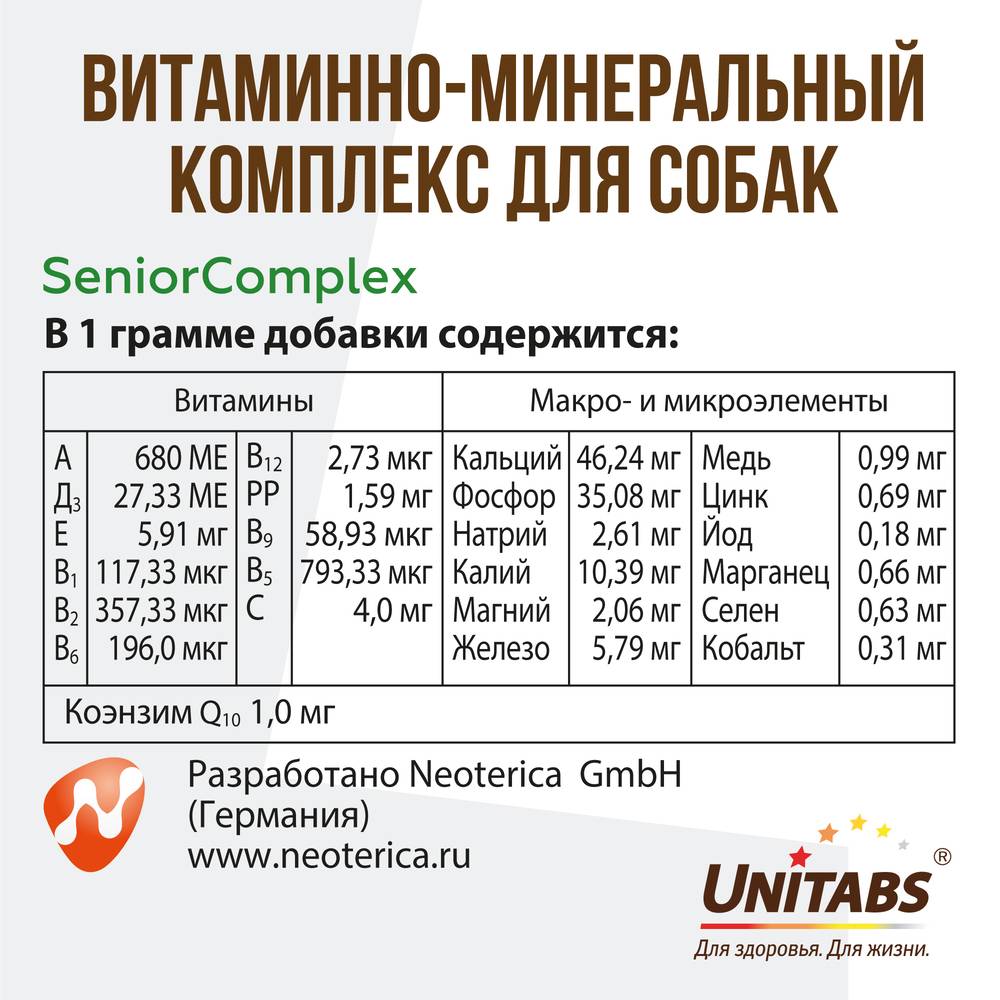 Unitabs SeniorComplex — это витаминно-минеральный комплекс для собак старше 7 лет, который содержит коэнзим Q10 и все необходимые витамины, макро- и микроэлементы для нормализации обмена веществ и укрепления иммунитета.