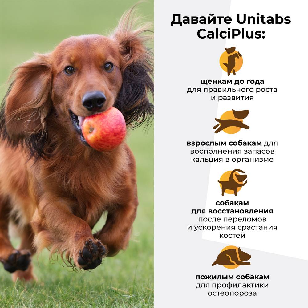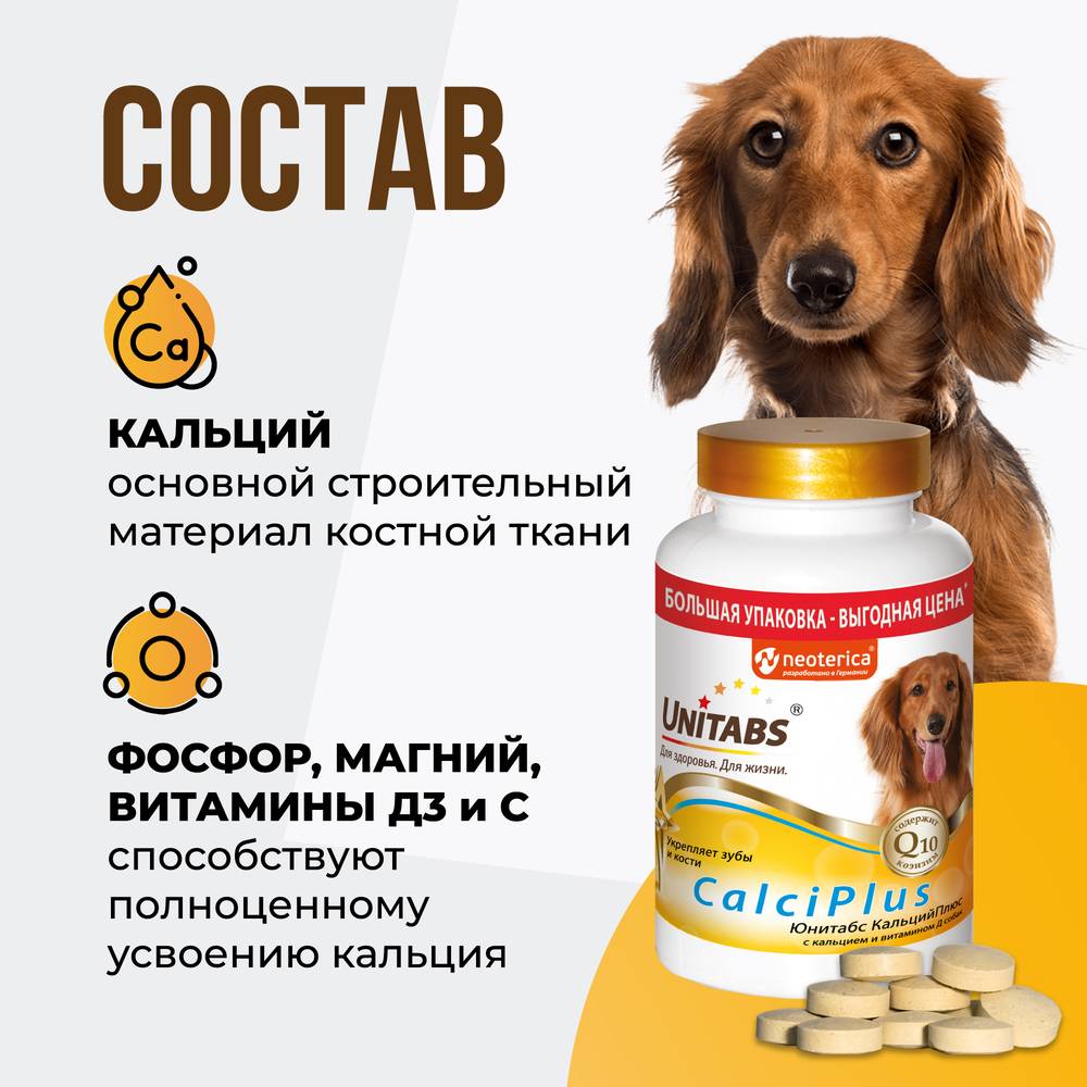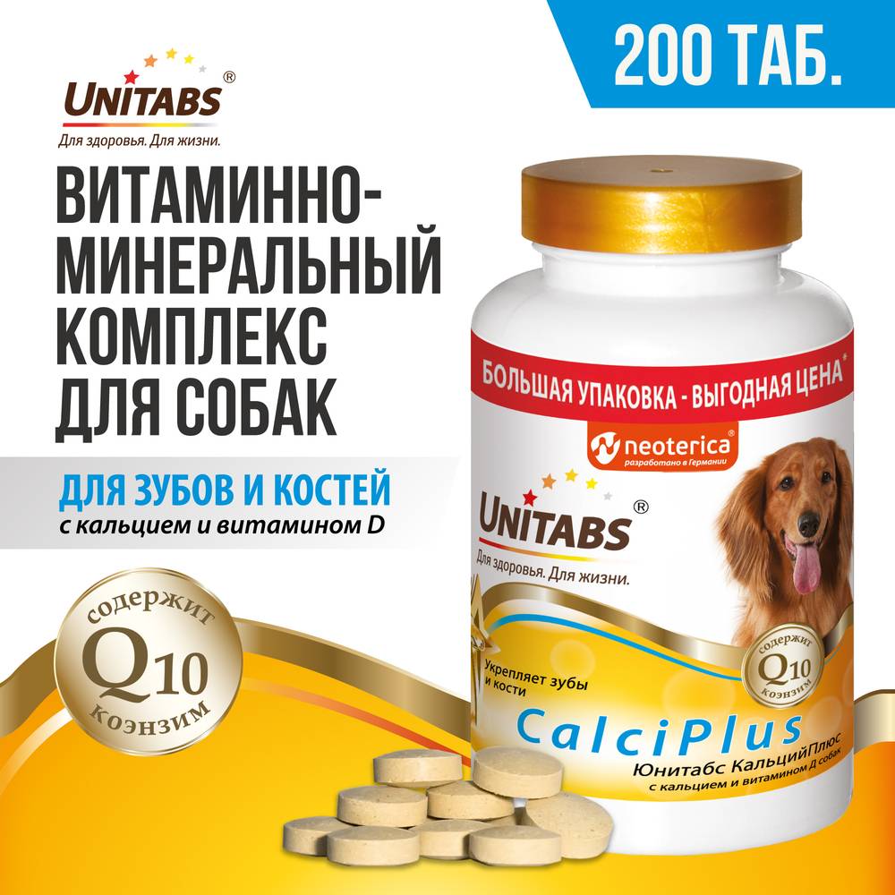 Unitabs CalciPlus — это витаминно-минеральный комплекс для собак любого возраста и породы, который содержит коэнзим Q10 и все необходимые витамины, макро- и микроэлементы для укрепления костей и зубов.